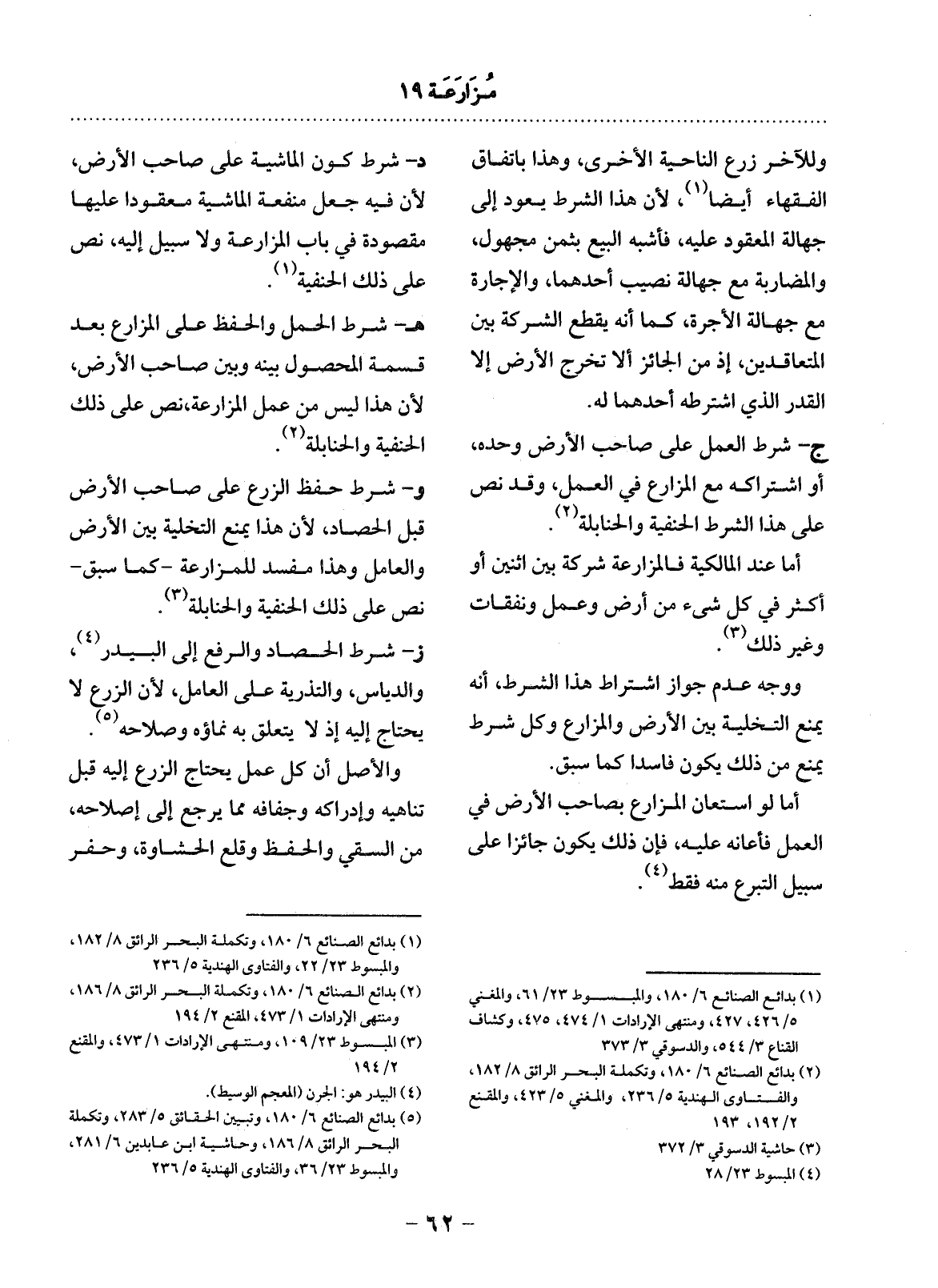 ج - شَرْطُ الْعَمَل عَلَى صَاحِبِ الأَْرْضِ وَحْدَهُ، أَوِ اشْتِرَاكُهُ مَعَ الْمَزَارِعِ فِي الْعَمَل، وَقَدْ نَصَّ عَلَى هَذَا الشَّرْطِ الْحَنَفِيَّةُ وَالْحَنَابِلَةُ (2) . أَمَّا عِنْدَ الْمَالِكِيَّةِ فَالْمُزَارَعَةُ شَرِكَةٌ بَيْنَ اثْنَيْنِ أَوْ أَكْثَرَ فِي كُل شَيْءٍ مِنْ أَرْضٍ وَعَمَلٍ وَنَفَقَاتٍ وَغَيْرِ ذَلِكَ (3) .
