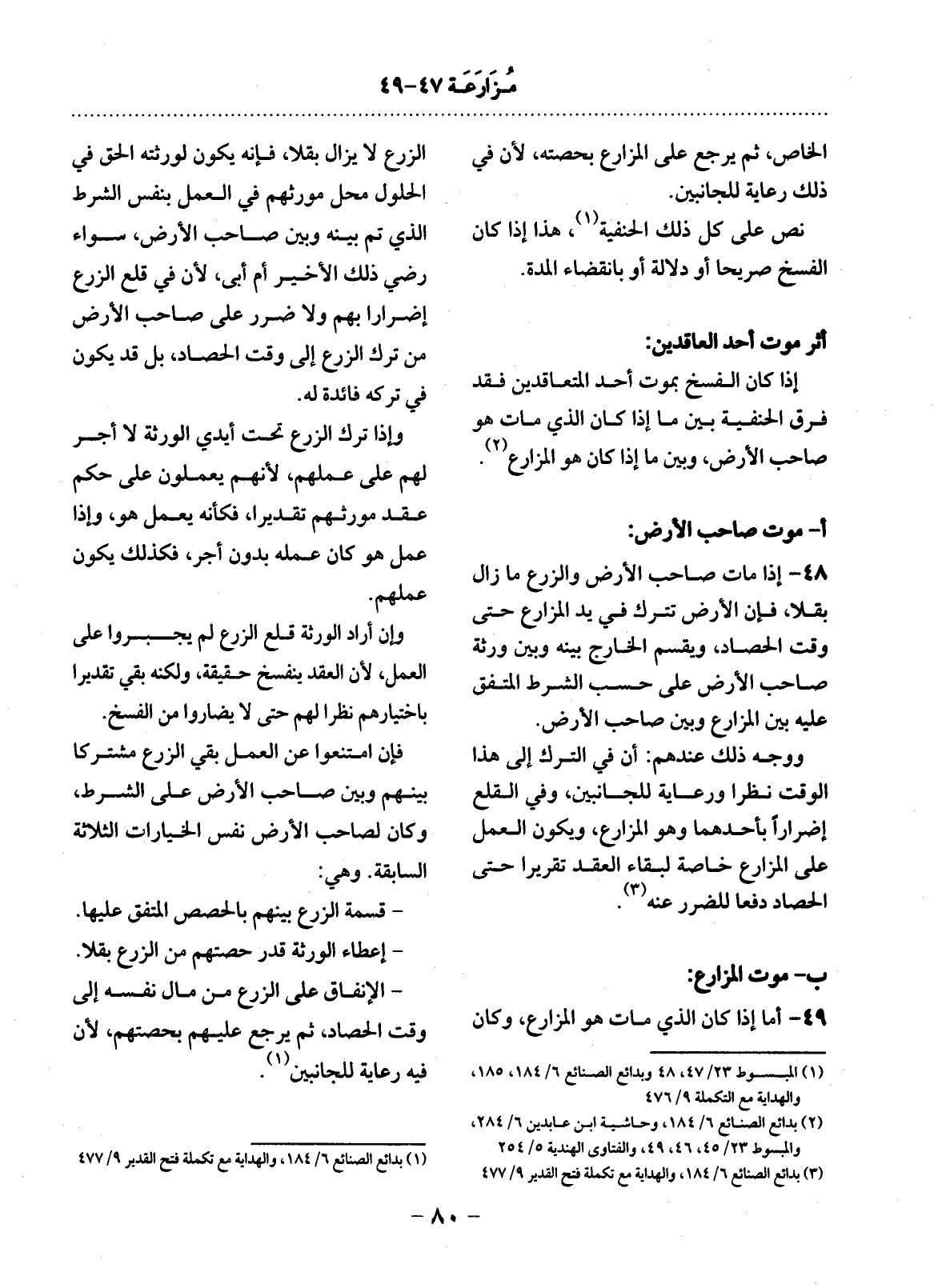 48 - إِذَا مَاتَ صَاحِبُ الأَْرْضِ وَالزَّرْعُ مَا زَال بَقْلاً، فَإِنَّ الأَْرْضَ تُتْرَكُ فِي يَدِ الْمُزَارِعِ حَتَّى وَقْتِ الْحَصَادِ، وَيُقْسَمُ الْخَارِجُ بَيْنَهُ وَبَيْنَ وَرَثَةِ صَاحِبِ الأَْرْضِ عَلَى حَسَبِ الشَّرْطِ الْمُتَّفَقِ عَلَيْهِ بَيْنَ الْمُزَارِعِ وَبَيْنَ صَاحِبِ الأَْرْضِ.