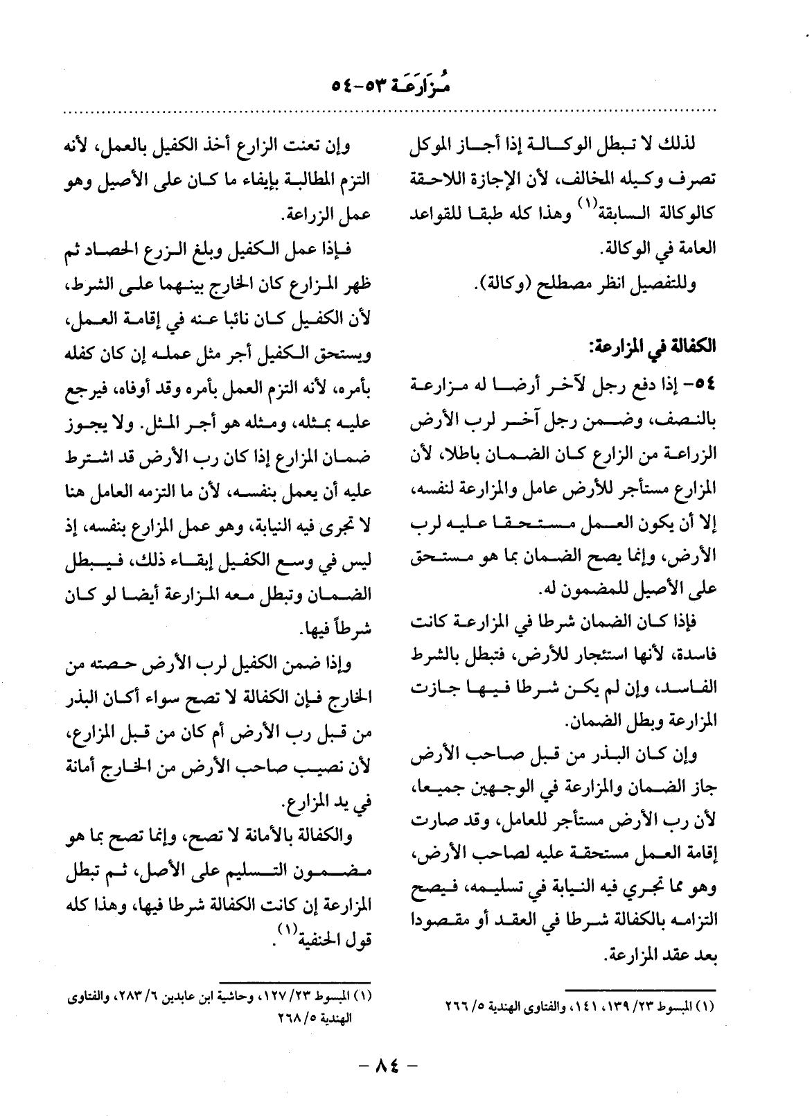 54 - إِذَا دَفَعَ رَجُلٌ لآِخَرَ أَرْضًا لَهُ مُزَارَعَةً بِالنِّصْفِ، وَضَمِنَ رَجُلٌ آخَرُ لِرَبِّ الأَْرْضِ الزِّرَاعَةَ مِنَ الزَّارِعِ كَانَ الضَّمَانُ بَاطِلاً، لأَِنَّ الْمُزَارِعَ مُسْتَأْجِرٌ لِلأَْرْضِ عَامِلٌ وَالْمُزَارَعَةُ لِنَفْسِهِ، إِلاَّ أَنْ يَكُونَ الْعَمَل مُسْتَحَقًّا عَلَيْهِ لِرَبِّ الأَْرْضِ، وَإِنَّمَا يَصِحُّ الضَّمَانُ بِمَا هُوَ مُسْتَحَقٌّ عَلَى الأَْصِيل لِلْمَضْمُونِ لَهُ.