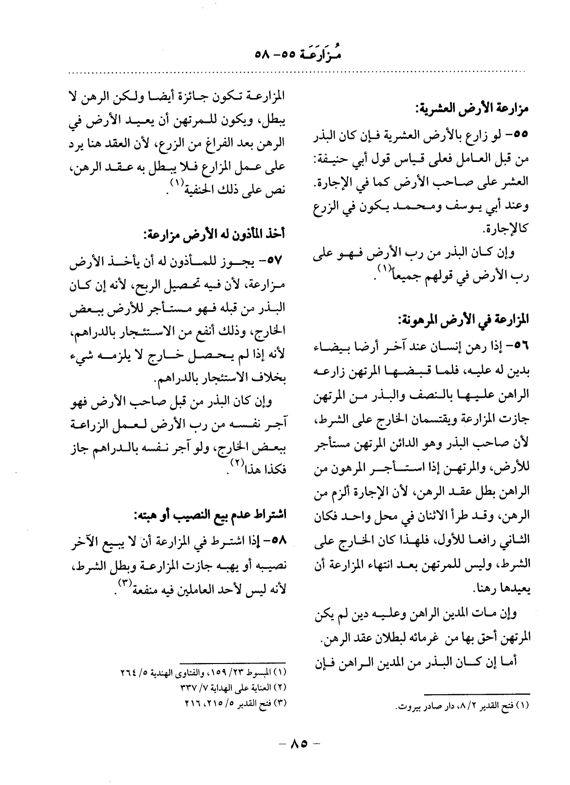 58 - إِذَا اشْتَرَطَ فِي الْمُزَارَعَةِ أَنْ لاَ يَبِيعَ الآْخَرُ نَصِيبَهُ أَوْ يَهَبَهُ جَازَتِ الْمُزَارَعَةُ وَبَطَل الشَّرْطُ، لأَِنَّهُ لَيْسَ لأَِحَدِ الْعَامِلَيْنِ فِيهِ مَنْفَعَةٌ (3) .
