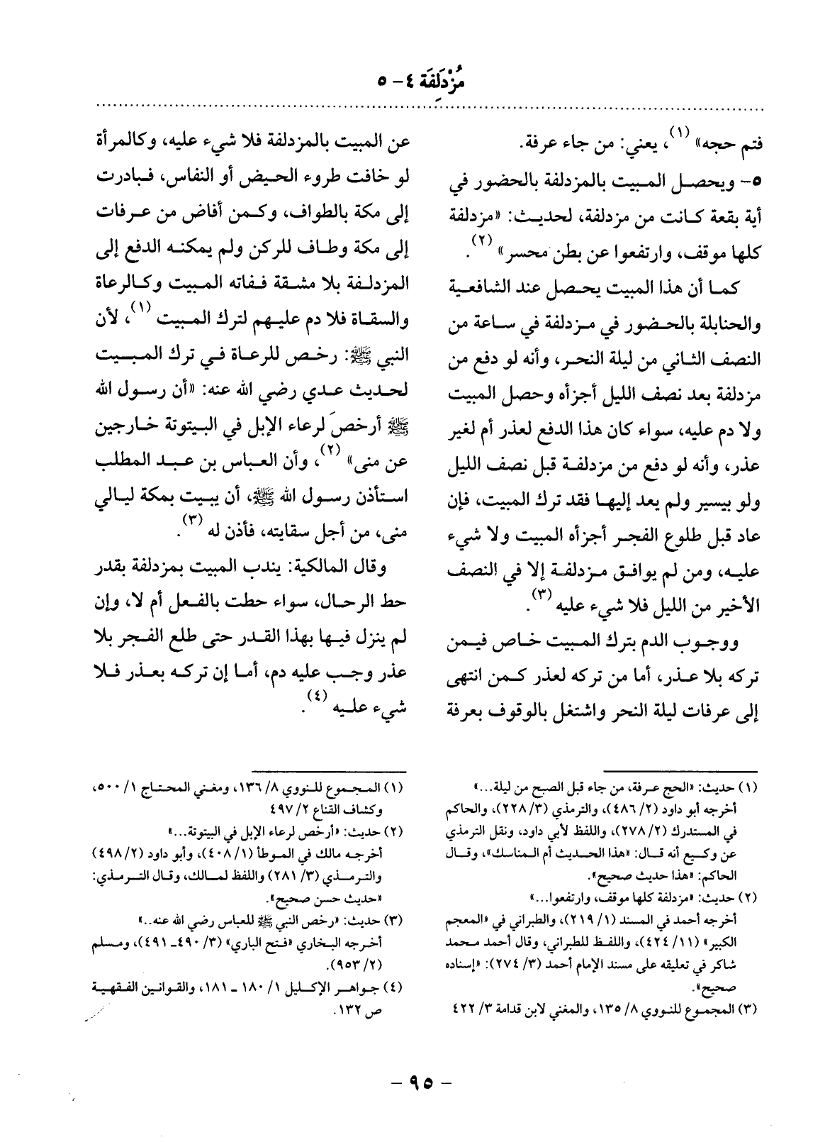 عَنِ الْمَبِيتِ بِالْمُزْدَلِفَةِ فَلاَ شَيْءَ عَلَيْهِ، وَكَالْمَرْأَةِ لَوْ خَافَتْ طُرُوءَ الْحَيْضِ أَوِ النِّفَاسِ، فَبَادَرَتْ إِلَى مَكَّةَ بِالطَّوَافِ، وَكَمَنْ أَفَاضَ مِنْ عَرَفَاتٍ إِلَى مَكَّةَ وَطَافَ لِلرُّكْنِ وَلَمْ يُمْكِنْهُ الدَّفْعُ إِلَى الْمُزْدَلِفَةِ بِلاَ مَشَقَّةٍ فَفَاتَهُ الْمَبِيتُ وَكَالرُّعَاةِ وَالسُّقَاةِ فَلاَ دَمَ عَلَيْهِمْ لِتَرْكِ الْمَبِيتِ (1) ، لأَِنَّ النَّبِيَّ صَلَّى اللَّهُ عَلَيْهِ وَسَلَّمَ: رَخَّصَ لِلرُّعَاةِ فِي تَرْكِ الْمَبِيتِ لِحَدِيثِ عَدِيٍّ رَضِيَ اللَّهُ عَنْهُ: أَنَّ رَسُول اللَّهِ صَلَّى اللَّهُ عَلَيْهِ وَسَلَّمَ أَرْخَصَ لِرِعَاءِ الإِْبِل فِي الْبَيْتُوتَةِ خَارِجِينَ عَنْ مِنًى (2) ، وَأَنَّ الْعَبَّاسَ بْنَ عَبْدِ الْمُطَّلِبِ اسْتَأْذَنَ رَسُول اللَّهِ صَلَّى اللَّهُ عَلَيْهِ وَسَلَّمَ أَنْ يَبِيتَ بِمَكَّةَ لَيَالِيَ مِنًى مِنْ أَجْل سِقَايَتِهِ فَأَذِنَ لَهُ (3) .