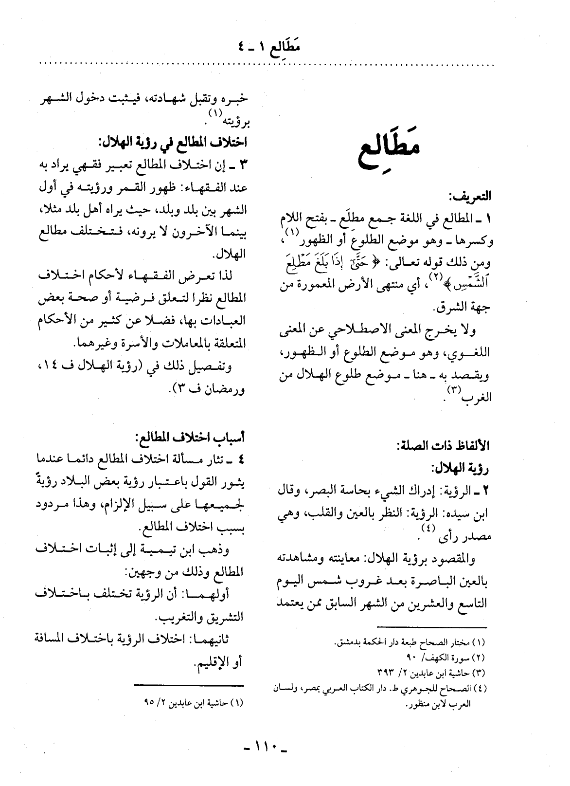 3 - إِِنَّ اخْتِلاَفَ الْمَطَالِعِ تَعْبِيرٌ فِقْهِيٌّ يُرَادُ بِهِ عِنْدَ الْفُقَهَاءِ: ظُهُورُ الْقَمَرِ وَرُؤْيَتُهُ فِي أَوَّل الشَّهْرِ بَيْنَ بَلَدٍ وَبَلَدٍ، حَيْثُ يَرَاهُ أَهْل بَلَدٍ مَثَلاً، بَيْنَمَا الآْخَرُونَ لاَ يَرَوْنَهُ، فَتَخْتَلِفُ مَطَالِعُ الْهِلاَل.
