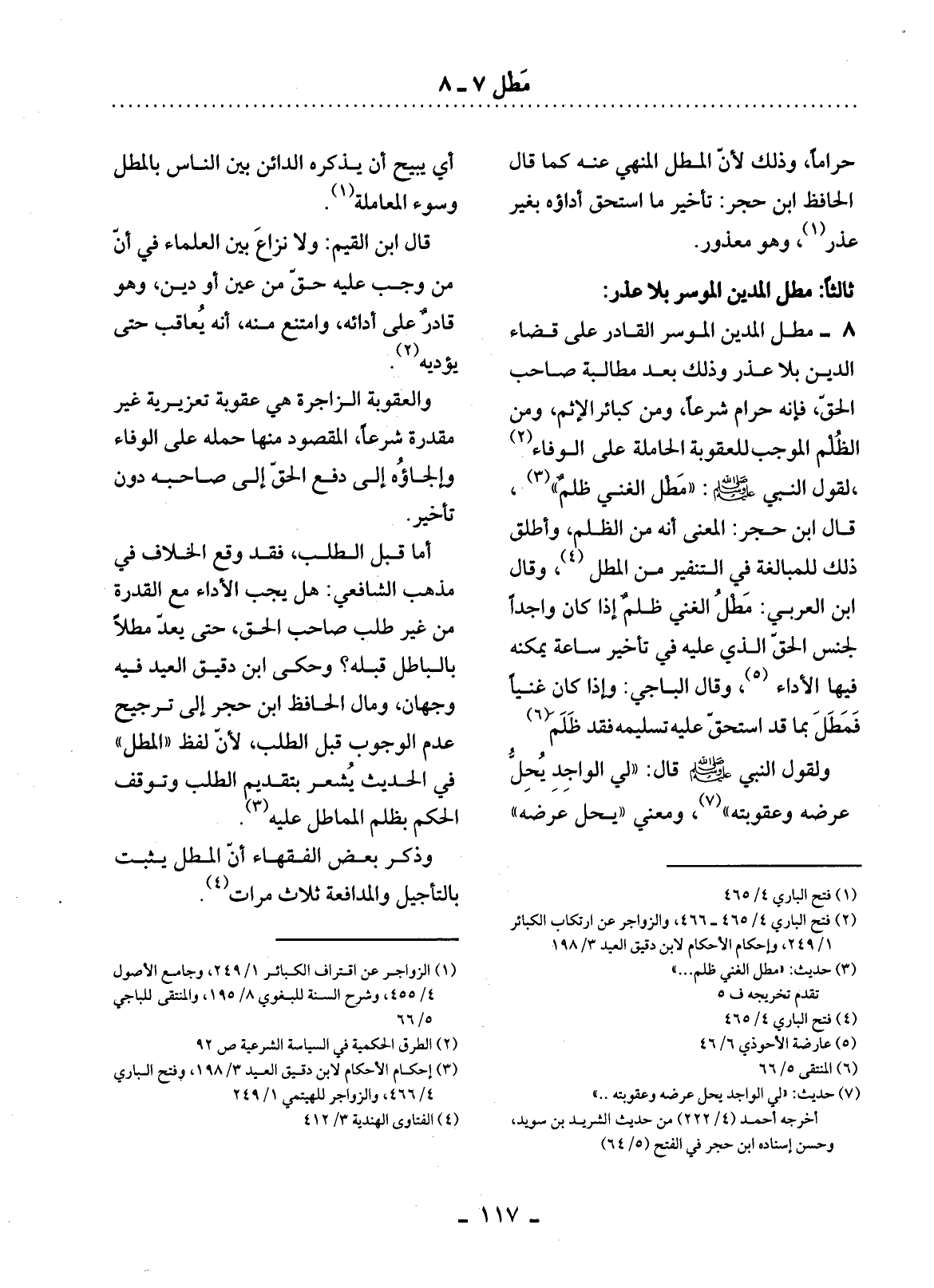 (7) حديث: " لي الواجد يحل عرضه وعقوبته. . " أخرجه أحمد (4 / 222) من حديث الشريد بن سويد، وحسن إسناده ابن حجر في الفتح (5 / 64)