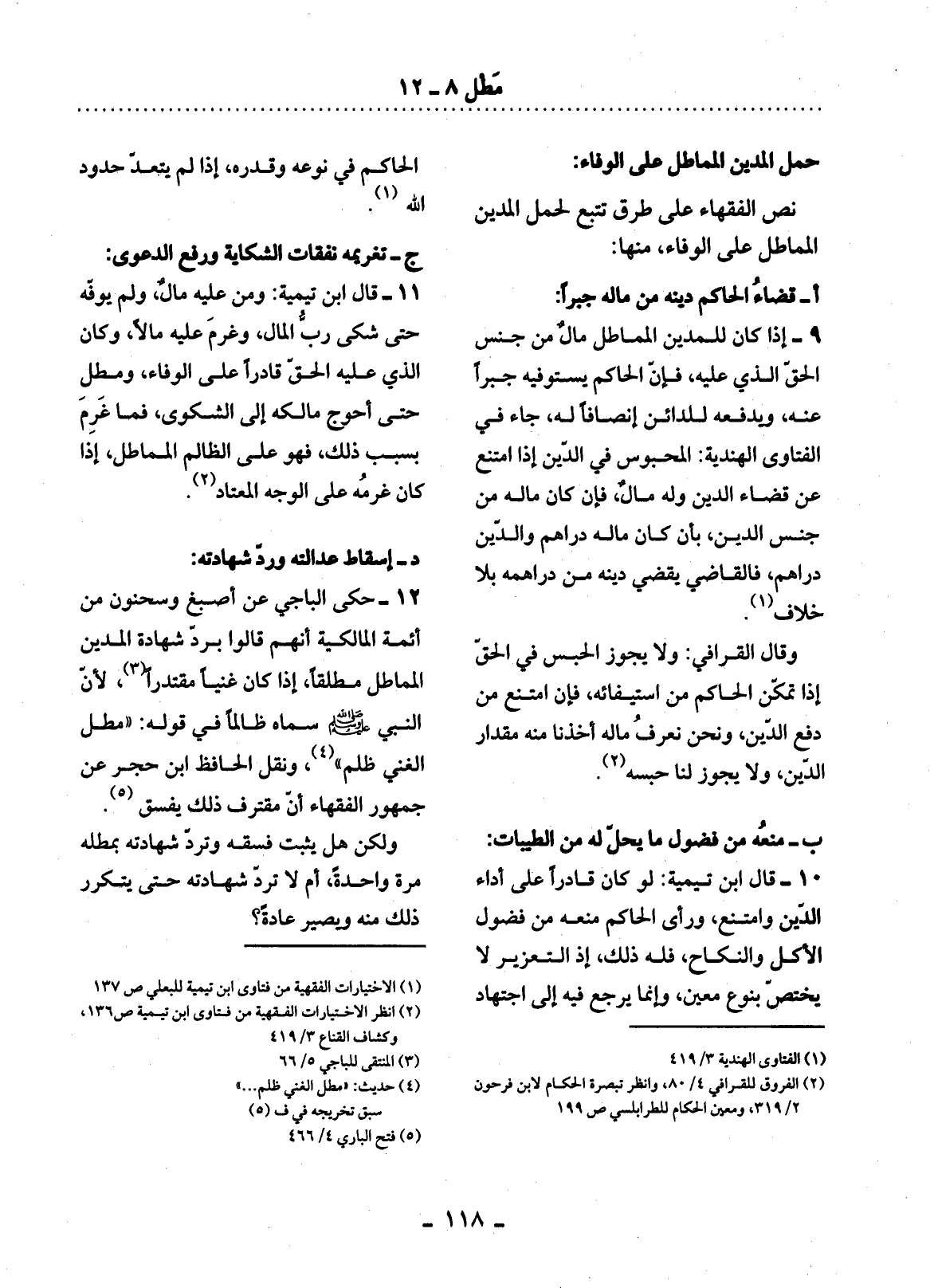 12 - حَكَى الْبَاجِيُّ عَنْ أَصْبَغَ وَسَحْنُونٍ مِنْ أَئِمَّةِ الْمَالِكِيَّةِ أَنَّهُمْ قَالُوا بِرِدِّ شَهَادَةِ الْمَدِينِ الْمُمَاطِل مُطْلَقًا، إِِذَا كَانَ غَنِيًّا مُقْتَدِرًا (3) ، لأَِنَّ النَّبِيَّ صَلَّى اللَّهُ عَلَيْهِ وَسَلَّمَ سَمَّاهُ ظَالِمًا فِي قَوْلِهِ: مَطْل الْغَنِيِّ ظُلْمٌ، (4) وَنَقَل الْحَافِظُ ابْنُ حَجَرٍ عَنْ جُمْهُورِ الْفُقَهَاءِ أَنَّ مُقْتَرِفَ ذَلِكَ يُفَسَّقُ (5) .