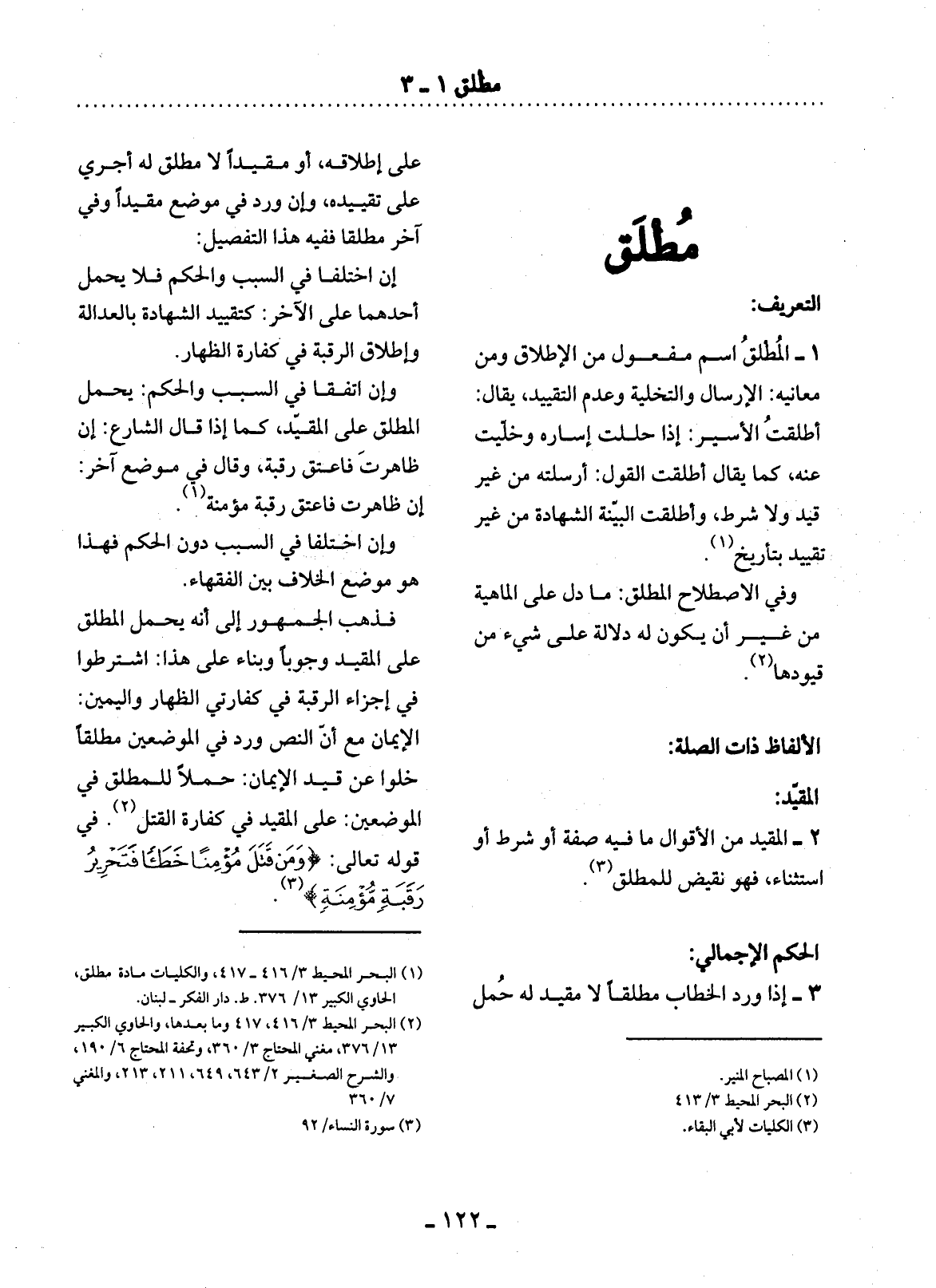 (1) البحر المحيط 3 / 416 - 417، والكليات مادة مطلق، الحاوي الكبير 13 / 376. ط. دار الفكر - لبنان.