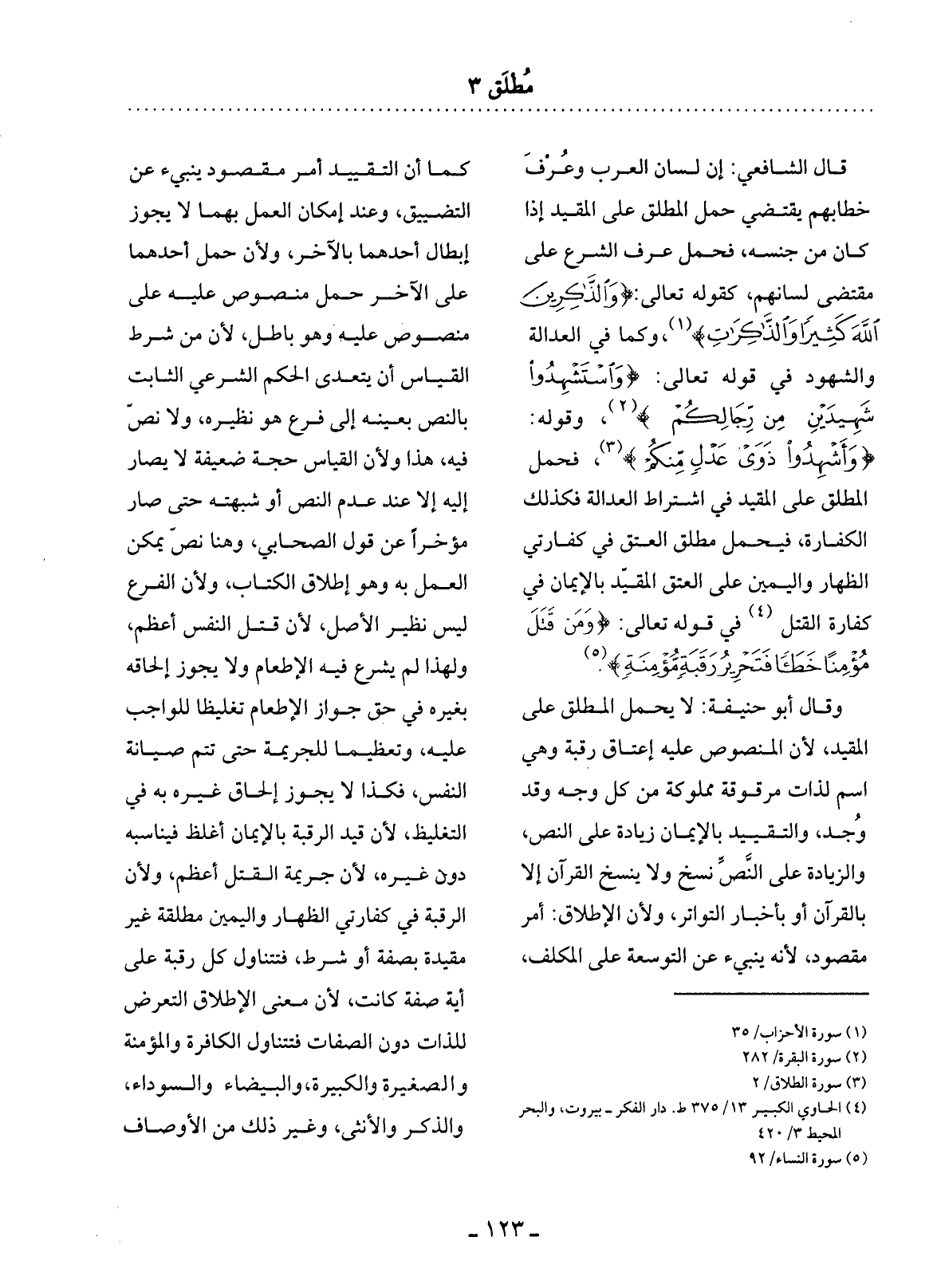 قَال الشَّافِعِيُّ: إِِنَّ لِسَانَ الْعَرَبِ وَعُرْفَ خِطَابِهِمْ يَقْتَضِي حَمْل الْمُطْلَقِ عَلَى الْمُقَيَّدِ إِِذَا كَانَ مِنْ جَنْسِهِ، فَحَمْل عُرْفِ الشَّرْعِ عَلَى مُقْتَضَى لِسَانِهِمْ، كَقَوْلِهِ تَعَالَى: {وَالذَّاكِرِينَ اللَّهَ كَثِيرًا وَالذَّاكِرَاتِ} ، (1) وَكَمَا فِي الْعَدَالَةِ وَالشُّهُودِ فِي قَوْلِهِ تَعَالَى: {وَاسْتَشْهِدُوا شَهِيدَيْنِ مِنْ رِجَالِكُمْ} ، (2) وَقَوْلِهِ: {وَأَشْهِدُوا ذَوَيْ عَدْلٍ مِنْكُمْ} ، (3) فَحُمِل الْمُطْلَقُ عَلَى الْمُقَيَّدِ فِي اشْتِرَاطِ الْعَدَالَةِ فَكَذَلِكَ الْكَفَّارَةُ، فَيُحْمَل مُطْلَقُ الْعِتْقِ فِي كَفَّارَتَيِ الظِّهَارِ وَالْيَمِينِ عَلَى الْعِتْقِ الْمُقَيَّدِ بِالإِِِْيمَانِ فِي كَفَّارَةِ الْقَتْل (4) فِي قَوْلِهِ تَعَالَى: {وَمَنْ قَتَل مُؤْمِنًا خَطَأً فَتَحْرِيرُ رَقَبَةٍ مُؤْمِنَةٍ} . (5)