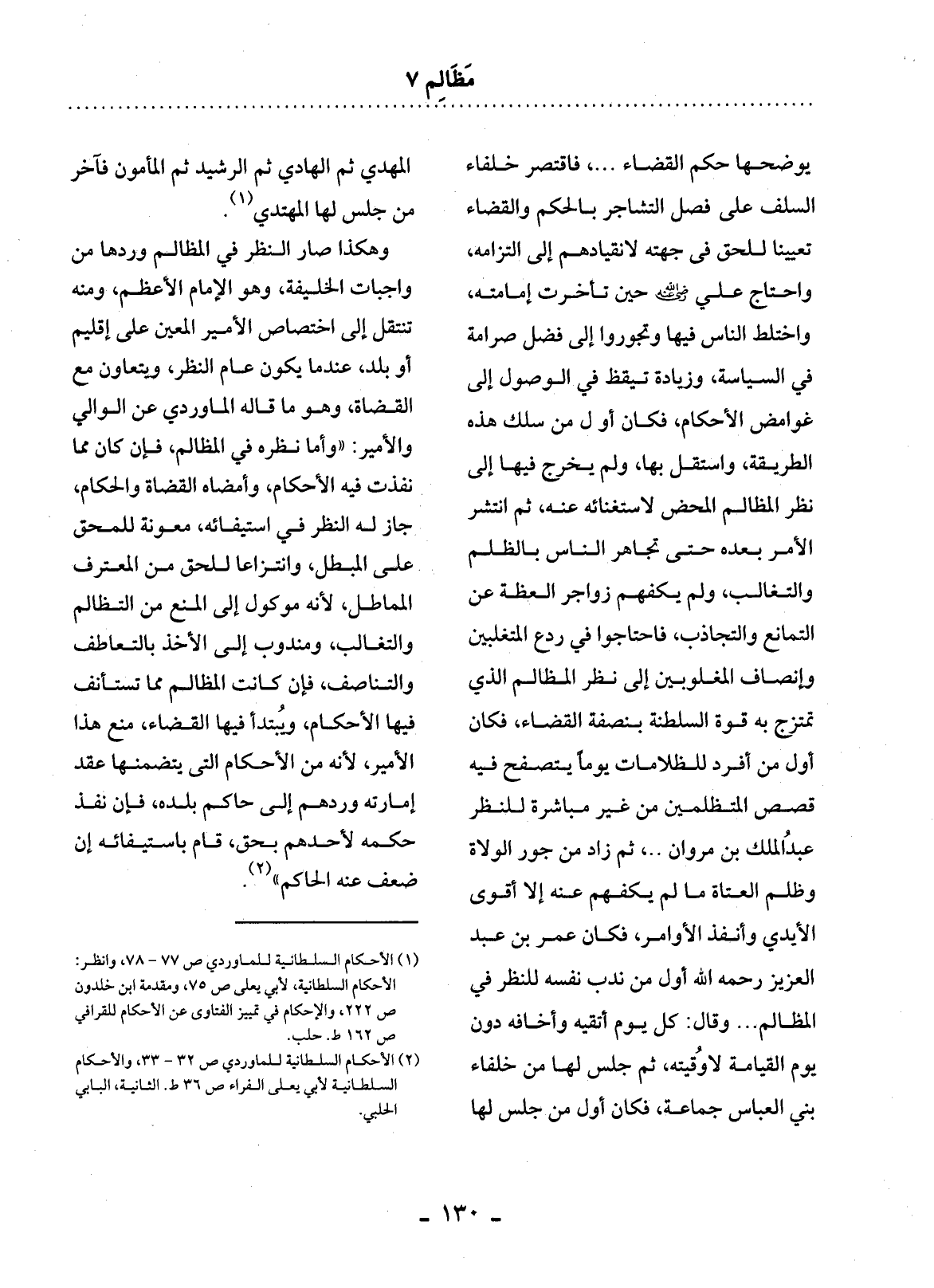يُوَضِّحُهَا حُكْمُ الْقَضَاءِ.، فَاقْتَصَرَ خُلَفَاءُ السَّلَفِ عَلَى فَصْل التَّشَاجُرِ بِالْحُكْمِ وَالْقَضَاءِ تَعْيِينًا لِلْحَقِّ فِي جِهَتِهِ لاِنْقِيَادِهِمْ إِِلَى الْتِزَامِهِ، وَاحْتَاجَ عَلِيٌّ رَضِيَ اللَّهُ عَنْهُ حِينَ تَأَخَّرَتْ إِِمَامَتُهُ، وَاخْتَلَطَ النَّاسُ فِيهَا وَتَجَوَّرُوا إِِلَى فَضْل صَرَامَةٍ فِي السِّيَاسَةِ، وَزِيَادَةِ تَيَقُّظٍ فِي الْوُصُول إِِلَى غَوَامِضِ الأَْحْكَامِ، فَكَانَ أَوَّل مَنْ سَلَكَ هَذِهِ الطَّرِيقَةَ، وَاسْتَقَل بِهَا، وَلَمْ يَخْرُجْ فِيهَا إِِلَى نَظَرِ الْمَظَالِمِ الْمَحْضِ لاِسْتِغْنَائِهِ عَنْهُ، ثُمَّ انْتَشَرَ الأَْمْرُ بَعْدَهُ حَتَّى تَجَاهَرَ النَّاسُ بِالظُّلْمِ وَالتَّغَالُبِ، وَلَمْ يَكْفِهِمْ زَوَاجِرُ الْعِظَةِ عَنِ التَّمَانُعِ وَالتَّجَاذُبِ، فَاحْتَاجُوا فِي رَدْعِ الْمُتَغَلِّبِينَ وَإِِِنْصَافِ الْمَغْلُوبِينَ إِِلَى نَظَرِ الْمَظَالِمِ الَّذِي تَمْتَزِجُ بِهِ قُوَّةُ السَّلْطَنَةِ بِنَصَفَةِ الْقَضَاءِ، فَكَانَ أَوَّل مَنْ أَفْرَدَ لِلظُّلاَمَاتِ يَوْمًا يَتَصَفَّحُ فِيهِ قَصَصَ الْمُتَظَلِّمِينَ مِنْ غَيْرِ مُبَاشَرَةٍ لِلنَّظَرِ عَبْدُ الْمَلِكِ بْنُ مَرْوَانَ. .، ثُمَّ زَادَ مِنْ جَوْرِ الْوُلاَةِ وَظُلْمِ الْعُتَاةِ مَا لَمْ يَكْفِهِمْ عَنْهُ إِِلاَّ أَقْوَى الأَْيْدِي وَأَنْفَذُ الأَْوَامِرِ، فَكَانَ عُمَرُ بْنُ عَبْدِ الْعَزِيزِ رَحِمَهُ اللَّهُ أَوَّل مَنْ نَدَبَ نَفْسَهُ لِلنَّظَرِ فِي الْمَظَالِمِ. وَقَال: كُل يَوْمٍ أَتَّقِيهِ وَأَخَافُهُ دُونَ يَوْمِ الْقِيَامَةِ لاَ وُقِيتُهُ، ثُمَّ جَلَسَ لَهَا مِنْ خُلَفَاءِ بَنِي الْعَبَّاسِ جَمَاعَةٌ، فَكَانَ أَوَّل مَنْ جَلَسَ لَهَا