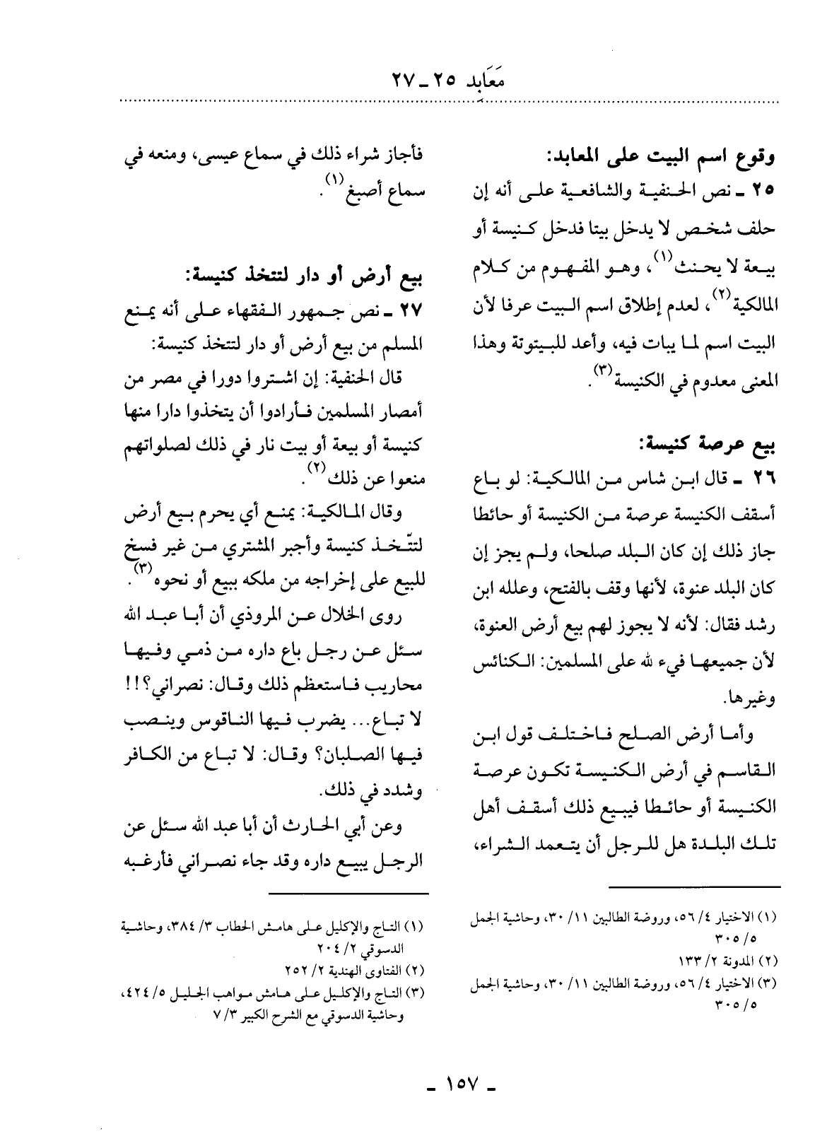 27 - نَصَّ جُمْهُورُ الْفُقَهَاءِ عَلَى أَنَّهُ يُمْنَعُ الْمُسْلِمُ مِنْ بَيْعِ أَرْضٍ أَوْ دَارٍ لِتُتَّخَذَ كَنِيسَةً: