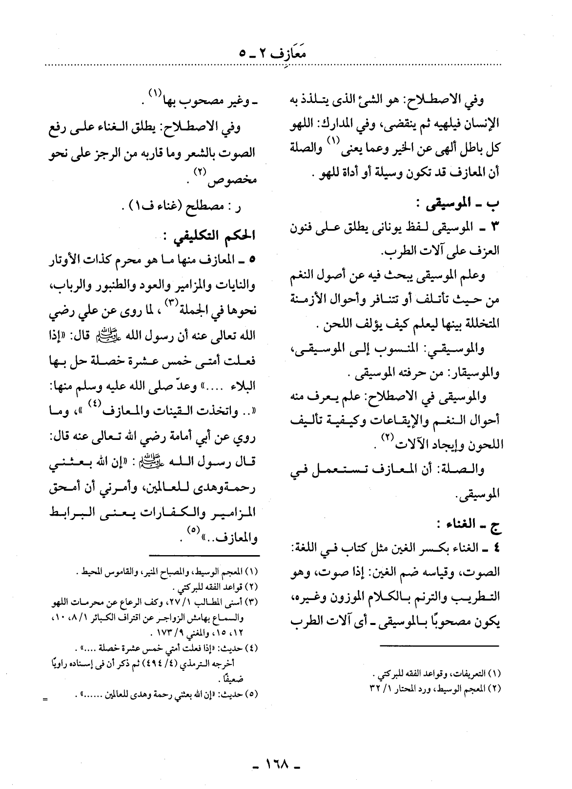 5 - الْمَعَازِفُ مِنْهَا مَا هُوَ مُحَرَّمٌ كَذَاتِ الأَْوْتَارِ وَالنَّايَاتِ وَالْمَزَامِيرِ وَالْعُودِ وَالطُّنْبُورِ وَالرَّبَابِ، نَحْوُهَا فِي الْجُمْلَةِ (3) ، لِمَا رُوِيَ عَنْ عَلِيٍّ رَضِيَ اللَّهُ تَعَالَى عَنْهُ أَنَّ رَسُول اللَّهِ صَلَّى اللَّهُ عَلَيْهِ وَسَلَّمَ قَال: إِِذَا فَعَلَتْ أُمَّتِي خَمْسَ عَشْرَةَ خَصْلَةً حَل بِهَا الْبَلاَءُ وَعَدَّ صَلَّى اللَّهُ عَلَيْهِ وَسَلَّمَ مِنْهَا: وَاتَّخَذَتِ الْقَيْنَاتِ وَالْمَعَازِفَ (4) ، وَمَا رُوِيَ عَنْ أَبِي أُمَامَةَ رَضِيَ اللَّهُ تَعَالَى عَنْهُ قَال: قَال رَسُول اللَّهِ صَلَّى اللَّهُ عَلَيْهِ وَسَلَّمَ: إِِنَّ اللَّهَ بَعَثَنِي رَحْمَةً وَهُدًى لِلْعَالَمِينَ، وَأَمَرَنِي أَنْ أَمْحَقَ الْمَزَامِيرَ وَالْكِنَّارَاتِ يَعْنِي الْبَرَابِطَ وَالْمَعَازِفَ (5) .