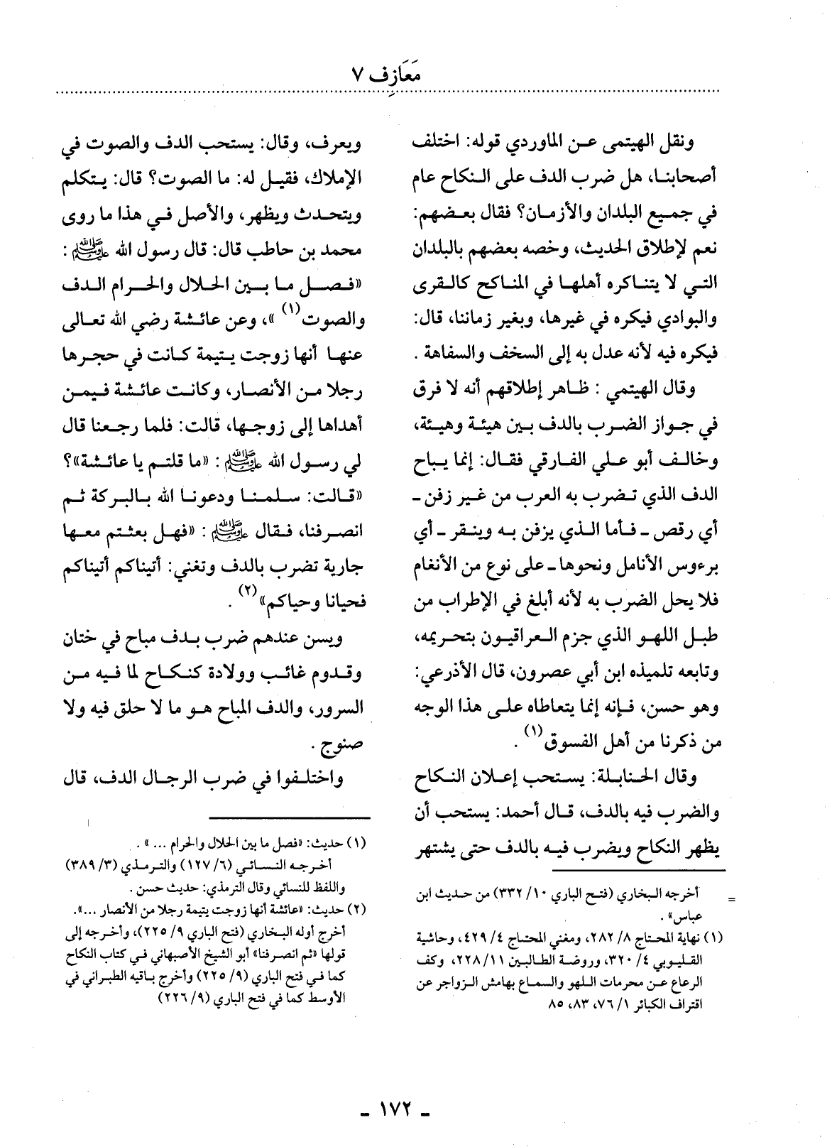 وَنَقَل الْهَيْتَمِيُّ عَنِ الْمَاوَرْدِيِّ قَوْلَهُ: اخْتَلَفَ أَصْحَابُنَا، هَل ضَرْبُ الدُّفِّ عَلَى النِّكَاحِ عَامٌّ فِي جَمِيعِ الْبُلْدَانِ وَالأَْزْمَانِ؟ فَقَال بَعْضُهُمْ: نَعَمْ لإِِِِطْلاَقِ الْحَدِيثِ، وَخَصَّهُ بَعْضُهُمْ بِالْبُلْدَانِ الَّتِي لاَ يَتَنَاكَرُهُ أَهْلُهَا فِي الْمَنَاكِحِ كَالْقُرَى وَالْبَوَادِي فَيُكْرَهُ فِي غَيْرِهَا، وَبِغَيْرِ زَمَانِنَا، قَال: فَيُكْرَهُ فِيهِ لأَِنَّهُ عَدَل بِهِ إِِلَى السَّخْفِ وَالسَّفَاهَةِ.