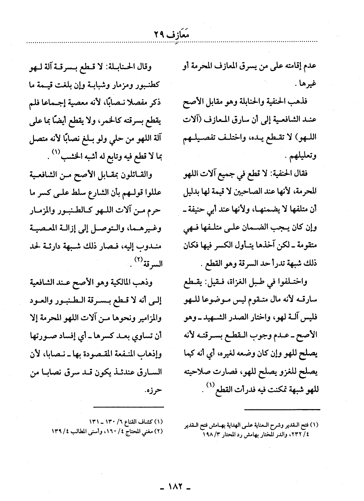 عَدَمِ إِِقَامَتِهِ عَلَى مَنْ يَسْرِقُ الْمَعَازِفَ الْمُحَرَّمَةَ أَوْ غَيْرَهَا. فَذَهَبَ الْحَنَفِيَّةُ وَالْحَنَابِلَةُ وَهُوَ مُقَابِل الأَْصَحِّ عِنْدَ الشَّافِعِيَّةِ إِِلَى أَنَّ سَارِقَ الْمَعَازِفِ (آلاَتِ اللَّهْوِ) لاَ تُقْطَعُ يَدُهُ، وَاخْتَلَفَ تَفْصِيلُهُمْ وَتَعْلِيلُهُمْ.