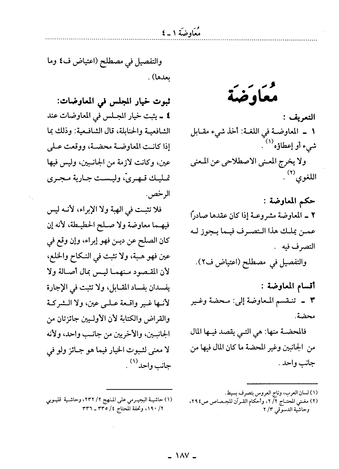 1 - الْمُعَاوَضَةُ فِي اللُّغَةِ: أَخْذُ شَيْءٍ مُقَابِل شَيْءٍ أَوْ إِِعْطَاؤُهُ. (1)