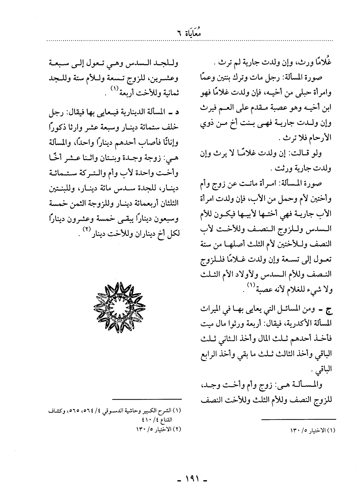 د - الْمَسْأَلَةُ الدِّينَارِيَّةُ فَيُعَايَى بِهَا فَيُقَال: رَجُلٌ خَلَّفَ سِتَّمِائَةَ دِينَارٍ وَسَبْعَةَ عَشَرَ وَارِثًا ذُكُورًا وَإِِنَاثًا فَأَصَابَ أَحَدُهُمْ دِينَارًا وَاحِدًا، وَالْمَسْأَلَةُ هِيَ: زَوْجَةٌ وَجَدَّةٌ وَبِنْتَانِ وَاثْنَا عَشَرَ أَخًا وَأُخْتًا وَاحِدَةً لأَِبٍ وَأُمٍّ وَالتَّرِكَةُ سِتُّمِائَةُ دِينَارٍ، لِلْجَدَّةِ سُدُسُ مِائَةِ دِينَارٍ، وَلِلْبِنْتَيْنِ الثُّلُثَانِ أَرْبَعُمِائَةُ دِينَارٍ وَلِلزَّوْجَةِ الثُّمُنُ خَمْسَةٌ وَسَبْعُونَ دِينَارًا يَبْقَى خَمْسَةٌ وَعِشْرُونَ دِينَارًا لِكُل أَخٍ دِينَارَانِ وَلِلأُْخْتِ دِينَارٌ. (2)