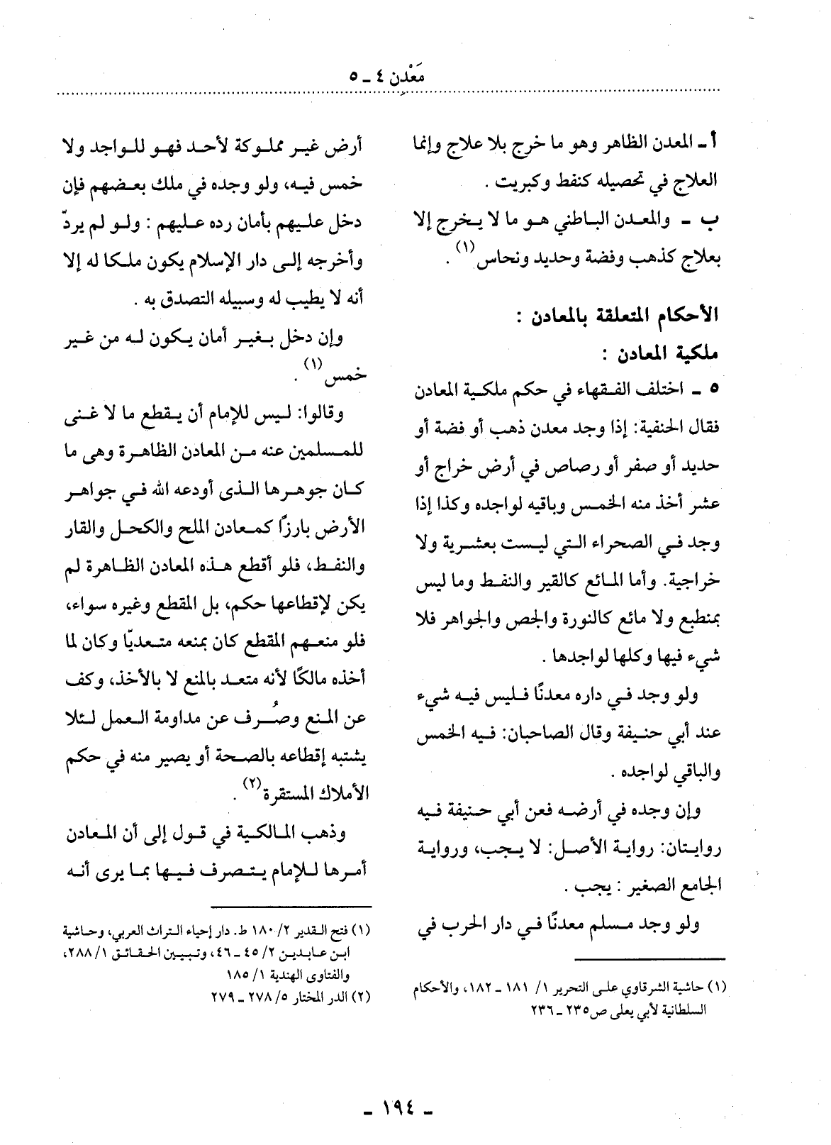 5 - اخْتَلَفَ الْفُقَهَاءُ فِي حُكْمِ مِلْكِيَّةِ الْمَعَادِنِ فَقَال الْحَنَفِيَّةُ: إِذَا وُجِدَ مَعْدِنُ ذَهَبٍ أَوْ فِضَّةٍ أَوْ حَدِيدٍ أَوْ صُفْرٍ أَوْ رَصَاصٍ فِي أَرْضِ خَرَاجٍ أَوْ عُشْرٍ أُخِذَ مِنْهُ الْخُمُسُ وَبَاقِيهِ لِوَاجِدِهِ وَكَذَا إِذَا وُجِدَ فِي الصَّحْرَاءِ الَّتِي لَيْسَتْ بِعُشْرِيَّةٍ وَلاَ خَرَاجِيَّةٍ. وَأَمَّا الْمَائِعُ كَالْقِيرِ وَالنِّفْطِ وَمَا لَيْسَ بِمُنْطَبِعٍ وَلاَ مَائِعٍ كَالنُّورَةِ وَالْجِصِّ وَالْجَوَاهِرِ فَلاَ شَيْءَ فِيهَا وَكُلُّهَا لِوَاجِدِهَا.