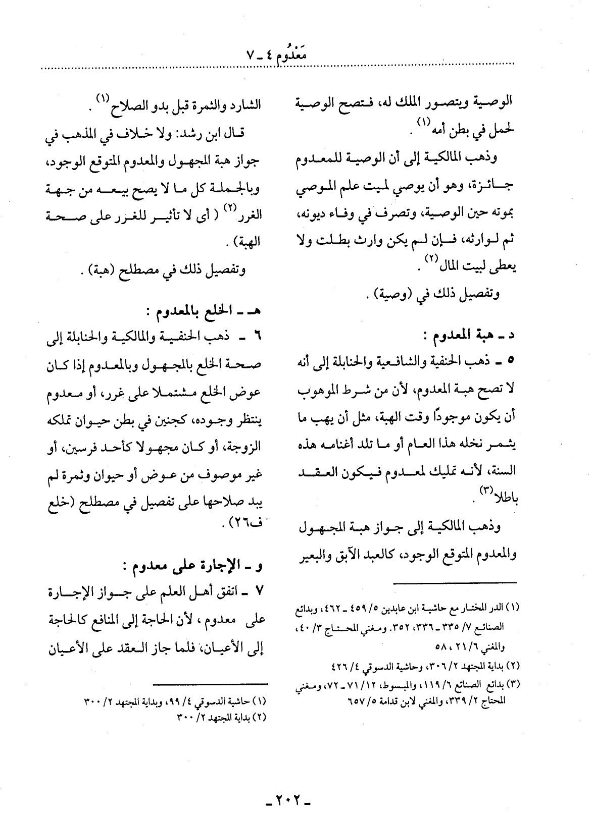 5 - ذَهَبَ الْحَنَفِيَّةُ وَالشَّافِعِيَّةُ وَالْحَنَابِلَةُ إِلَى أَنَّهُ لاَ تَصِحُّ هِبَةُ الْمَعْدُومِ لأَِنَّ مِنْ شَرْطِ الْمَوْهُوبِ أَنْ يَكُونَ مَوْجُودًا وَقْتَ الْهِبَةِ، مِثْل أَنْ يَهَبَ مَا يُثْمِرُ نَخْلُهُ هَذَا الْعَامَ أَوْ مَا تَلِدُ أَغْنَامُهُ هَذِهِ السَّنَةَ، لأَِنَّهُ تَمْلِيكٌ لِمَعْدُومِ فَيَكُونُ الْعَقْدُ بَاطِلاً. (3)