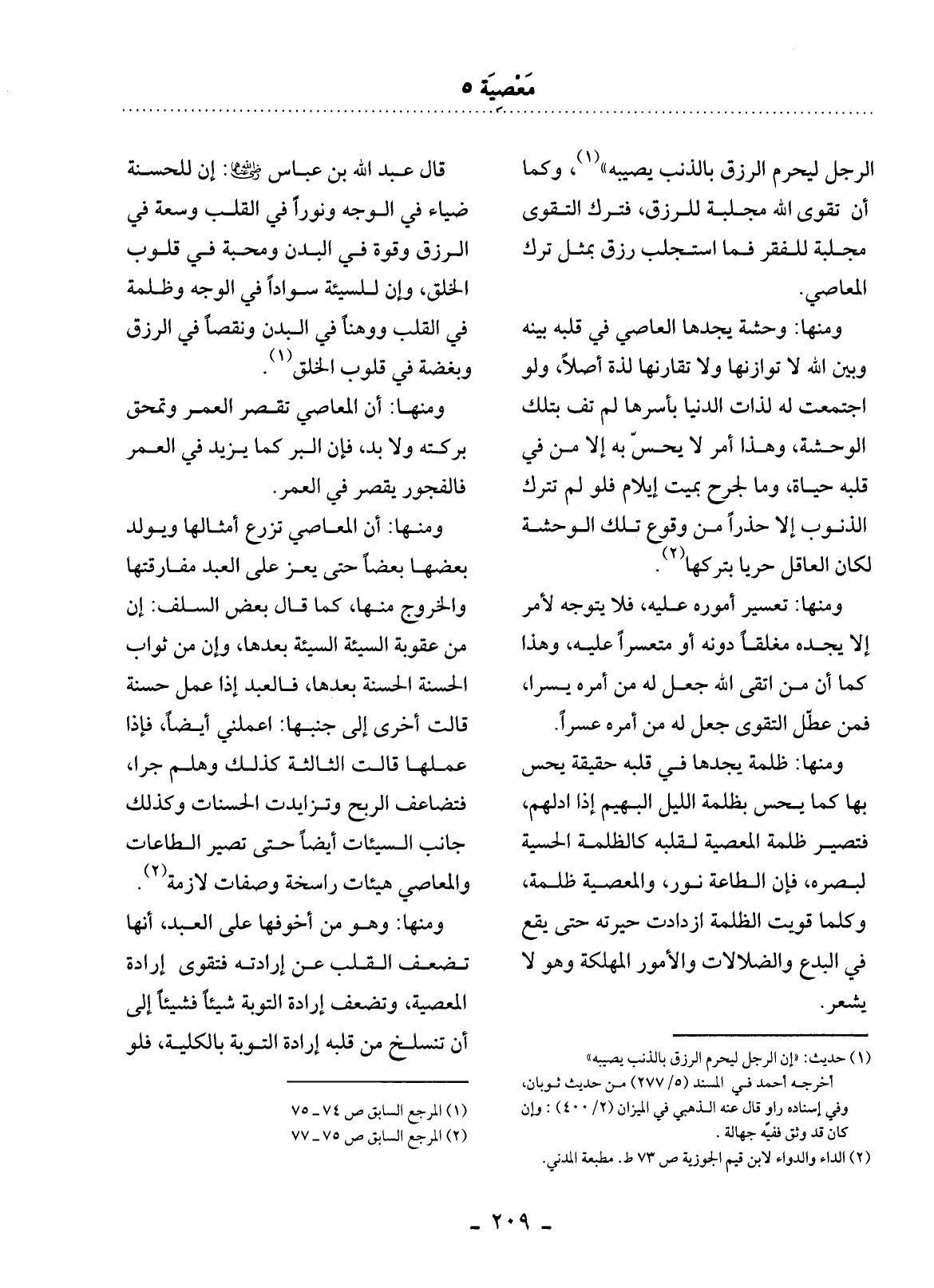 (2) الداء والدواء لابن قيم الجوزية ص 73 ط. مطبعة المدني.