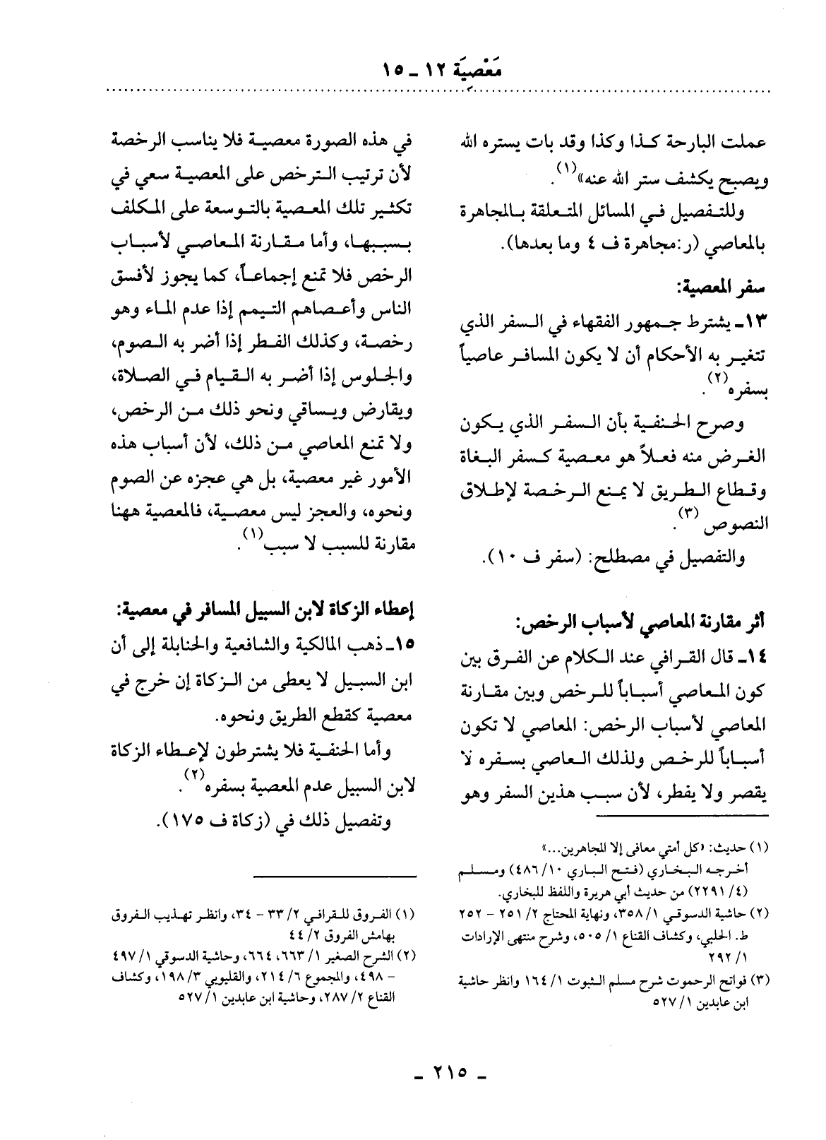 14 - قَال الْقَرَافِيُّ عِنْدَ الْكَلاَمِ عَنِ الْفَرْقِ بَيْنَ كَوْنِ الْمَعَاصِي أَسْبَابًا لِلرُّخَصِ وَبَيْنَ مُقَارَنَةِ الْمَعَاصِي لأَِسْبَابِ الرُّخَصِ الْمَعَاصِي لاَ تَكُونُ أَسْبَابًا لِلرُّخَصِ وَلِذَلِكَ الْعَاصِي بِسَفَرِهِ لاَ يَقْصُرُ وَلاَ يُفْطِرُ، لأَِنَّ سَبَبَ هَذَيْنِ السَّفَرُ وَهُوَ