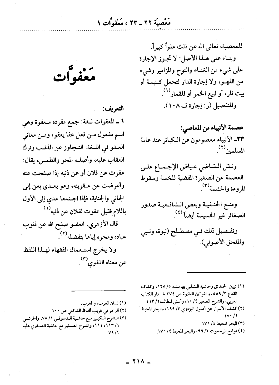 1 - الْمَعْفُوَّاتِ لُغَةً: جَمْعٌ مُفْرَدُهُ مَعْفُوَّةٌ وَهِيَ اسْمُ مَفْعُولٍ مِنْ فِعْل عَفَا يَعْفُو، وَمِنْ مَعَانِي الْعَفْوِ فِي اللُّغَةِ: التَّجَاوُزُ عَنِ الذَّنْبِ وَتَرْكُ الْعِقَابِ عَلَيْهِ، وَأَصْلُهُ الْمَحْوِ وَالطَّمْسِ، يُقَال: عَفَوْتُ عَنْ فُلاَنٍ أَوْ عَنْ ذَنْبِهِ إِذَا صَفَحْتَ عَنْهُ وَأَعْرَضْتَ عَنْ عُقُوبَتِهِ وَهُوَ يُعَدَّى بِعَنْ إِلَى الْجَانِي وَالْجِنَايَةِ، فَإِِذَا اجْتَمَعَا عُدِّيَ إِلَى الأَْوَّل بِاللاَّمِ فَقِيل عَفَوْتُ لِفُلاَنِ عَنْ ذَنْبِهِ. (1)