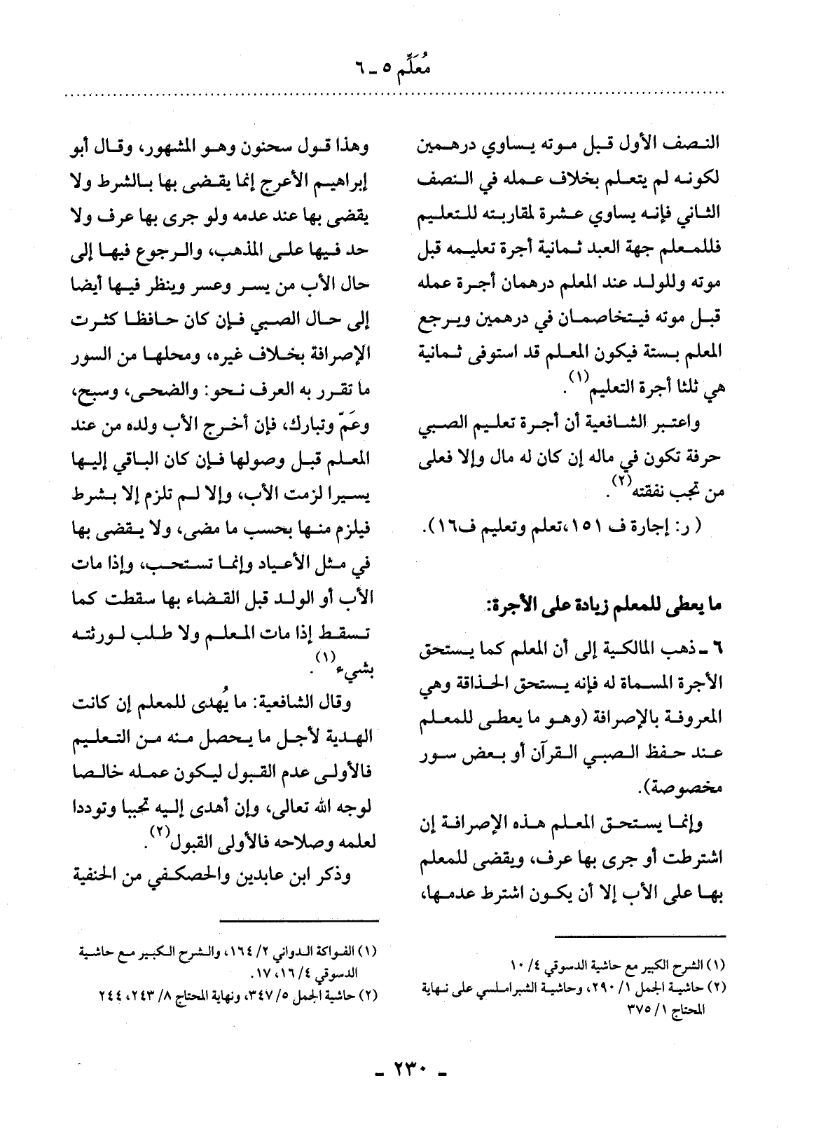 وَهَذَا قَوْل سَحْنُونٍ وَهُوَ الْمَشْهُورُ، وَقَال أَبُو إِبْرَاهِيمَ الأَْعْرَجُ إِنَّمَا يُقْضَى بِهَا بِالشَّرْطِ وَلاَ يُقْضَى بِهَا عِنْدَ عَدَمِهِ وَلَوْ جَرَى بِهَا عُرْفٌ وَلاَ حَدَّ فِيهَا عَلَى الْمَذْهَبِ، وَالرُّجُوعُ فِيهَا إِلَى حَال الأَْبِ مِنْ يُسْرٍ وَعُسْرٍ وَيُنْظَرُ فِيهَا أَيْضًا إِلَى حَال الصَّبِيِّ فَإِنْ كَانَ حَافِظًا كَثُرَتِ الإِْصْرَافَةُ بِخِلاَفِ غَيْرِهِ، وَمَحَلُّهَا مِنَ السُّوَرِ مَا تَقَرَّرَ بِهِ الْعُرْفُ نَحْوَ: وَالضُّحَى، وَسَبِّحْ، وَعَمَّ وَتَبَارَكَ. فَإِنْ أَخْرَجَ الأَْبُ وَلَدَهُ مِنْ عِنْدِ الْمُعَلِّمِ قَبْل وُصُولِهَا فَإِنْ كَانَ الْبَاقِي إِلَيْهَا يَسِيرًا لَزِمَتِ الأَْبَ، وَإِلاَّ لَمْ تَلْزَمْ إِلاَّ بِشَرْطٍ فَيَلْزَمُ مِنْهَا بِحَسَبِ مَا مَضَى، وَلاَ يُقْضَى بِهَا فِي مِثْل الأَْعْيَادِ وَإِنَّمَا تُسْتَحَبُّ، وَإِذَا مَاتَ الأَْبُ أَوِ الْوَلَدُ قَبْل الْقَضَاءِ بِهَا سَقَطَتْ كَمَا تَسْقُطُ إِذَا مَاتَ الْمُعَلِّمُ وَلاَ طَلَبَ لِوَرَثَتِهِ بِشَيْءٍ (1) . وَقَال الشَّافِعِيَّةُ: مَا يُهْدَى لِلْمُعَلِّمِ إِنْ كَانَتِ الْهَدِيَّةُ لأَِجْل مَا يَحْصُل مِنْهُ مِنَ التَّعْلِيمِ فَالأَْوْلَى عَدَمُ الْقَبُول لِيَكُونَ عَمَلُهُ خَالِصًا لِوَجْهِ اللَّهِ تَعَالَى، وَإِنْ أُهْدِيَ إِلَيْهِ تَحَبُّبًا وَتَوَدُّدًا لِعِلْمِهِ وَصَلاَحِهِ فَالأَْوْلَى الْقَبُول (2) .