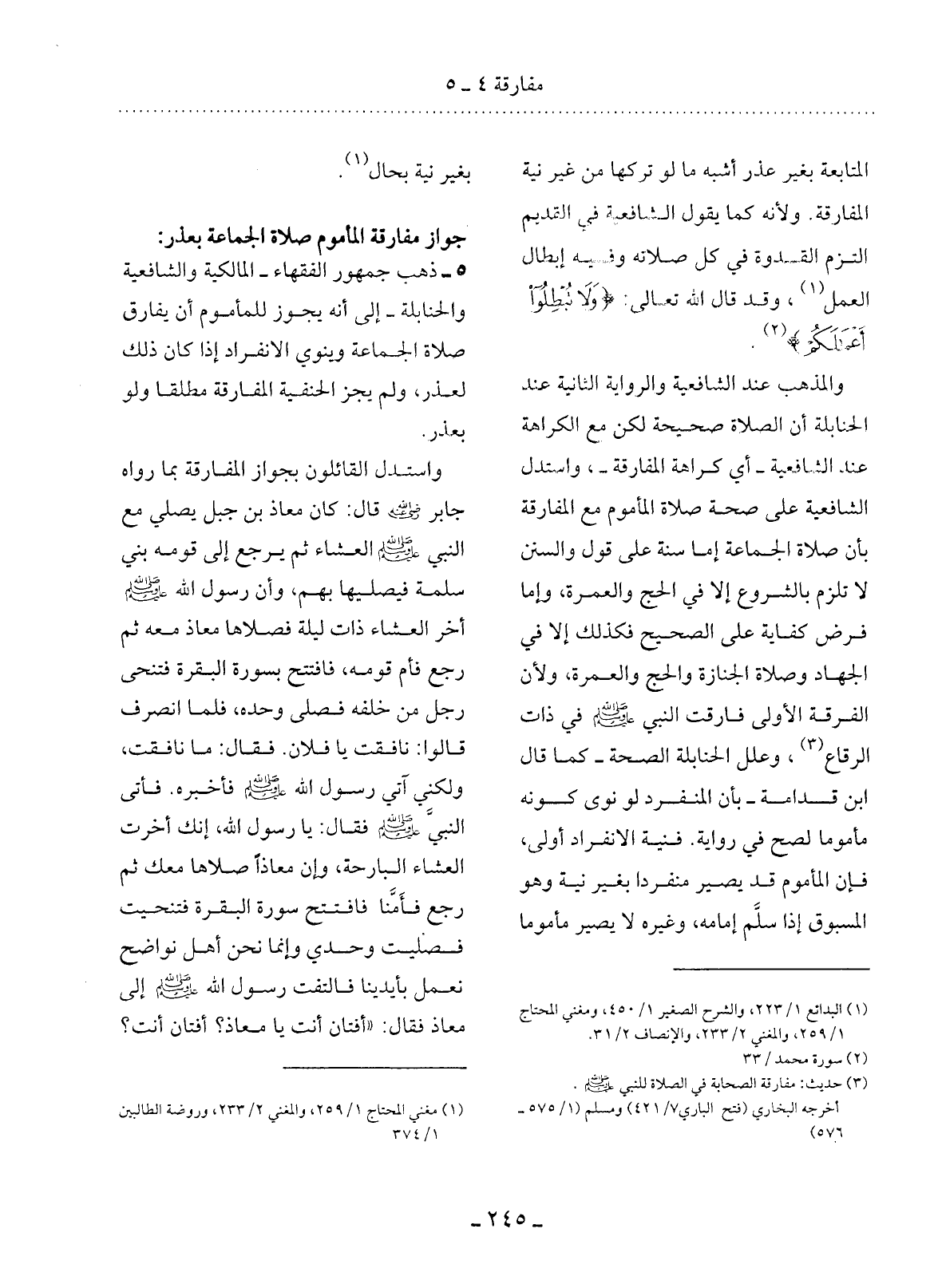 5 - ذَهَبَ جُمْهُورُ الْفُقَهَاءِ - الْمَالِكِيَّةُ وَالشَّافِعِيَّةُ وَالْحَنَابِلَةُ - إِلَى أَنَّهُ يَجُوزُ لِلْمَأْمُومِ أَنْ يُفَارِقَ صَلاَةَ الْجَمَاعَةِ وَيَنْوِيَ الاِنْفِرَادَ إِذَا كَانَ ذَلِكَ لِعُذْرٍ، وَلَمْ يُجِزِ الْحَنَفِيَّةُ الْمُفَارَقَةَ مُطْلَقًا وَلَوْ بِعُذْرٍ.