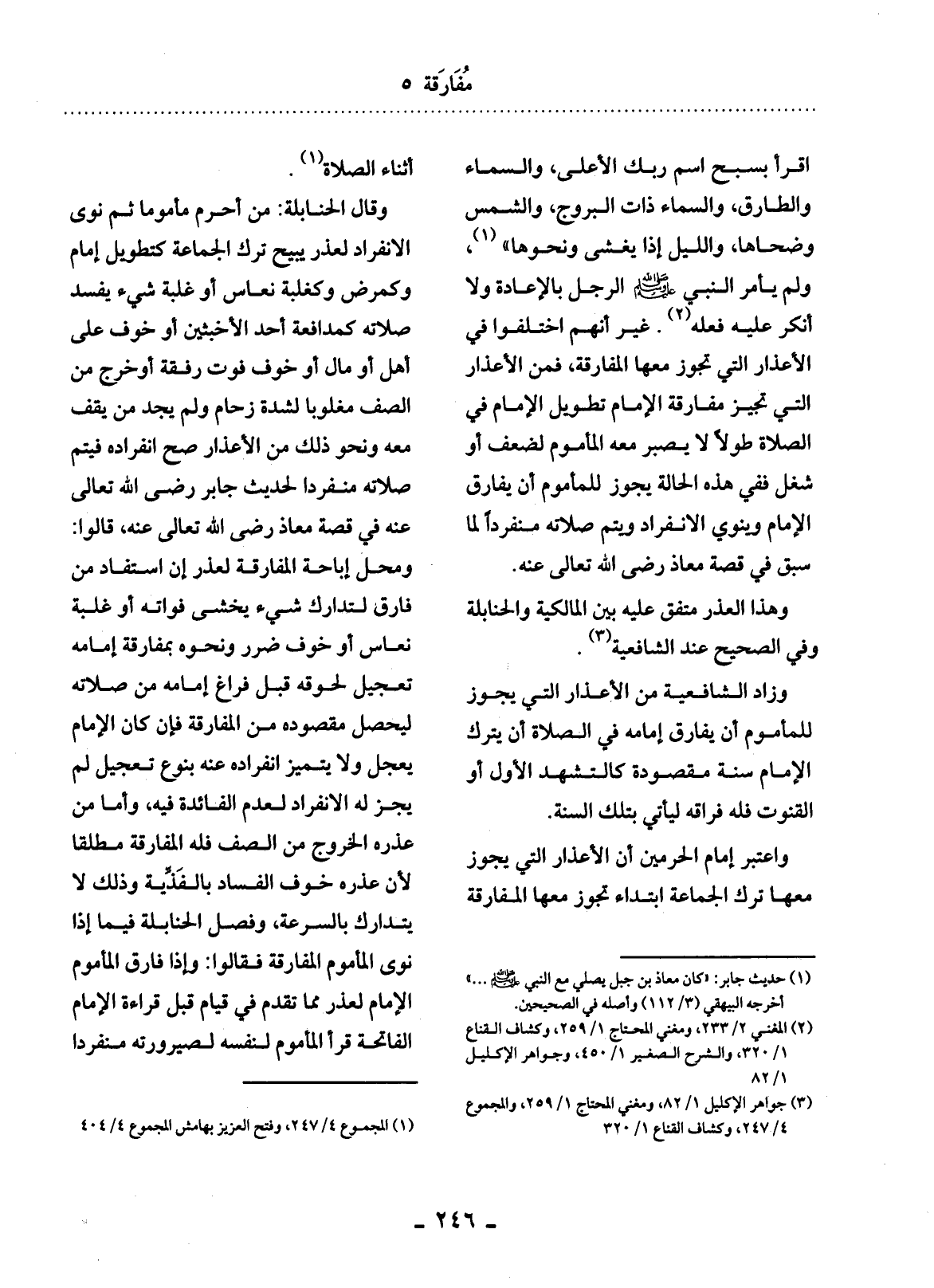 اقْرَأْ بِسَبِّحِ اسْمَ رَبِّك الأَْعْلَى، وَالسَّمَاءِ وَالطَّارِقِ، وَالسَّمَاءِ ذَاتِ الْبُرُوجِ، وَالشَّمْسِ وَضُحَاهَا، وَاللَّيْل إِذَا يَغْشَى وَنَحْوِهَا، (1) وَلَمْ يَأْمُرِ النَّبِيُّ صَلَّى اللَّهُ عَلَيْهِ وَسَلَّمَ الرَّجُل بِالإِْعَادَةِ وَلاَ أَنْكَرَ عَلَيْهِ فِعْلَهُ (2) . غَيْرَ أَنَّهُمُ اخْتَلَفُوا فِي الأَْعْذَارِ الَّتِي تَجُوزُ مَعَهَا الْمُفَارَقَةُ، فَمِنَ الأَْعْذَارِ الَّتِي تُجِيزُ مُفَارَقَةَ الإِْمَامِ تَطْوِيل الإِْمَامِ فِي الصَّلاَةِ طُولاً لاَ يَصْبِرُ مَعَهُ الْمَأْمُومُ لِضَعْفٍ أَوْ شُغْلٍ فَفِي هَذِهِ الْحَالَةِ يَجُوزُ لِلْمَأْمُومِ أَنْ يُفَارِقَ الإِْمَامَ وَيَنْوِيَ الاِنْفِرَادَ وَيُتِمَّ صَلاَتَهُ مُنْفَرِدًا لِمَا سَبَقَ فِي قِصَّةِ مُعَاذٍ رَضِيَ اللَّهُ تَعَالَى عَنْهُ.