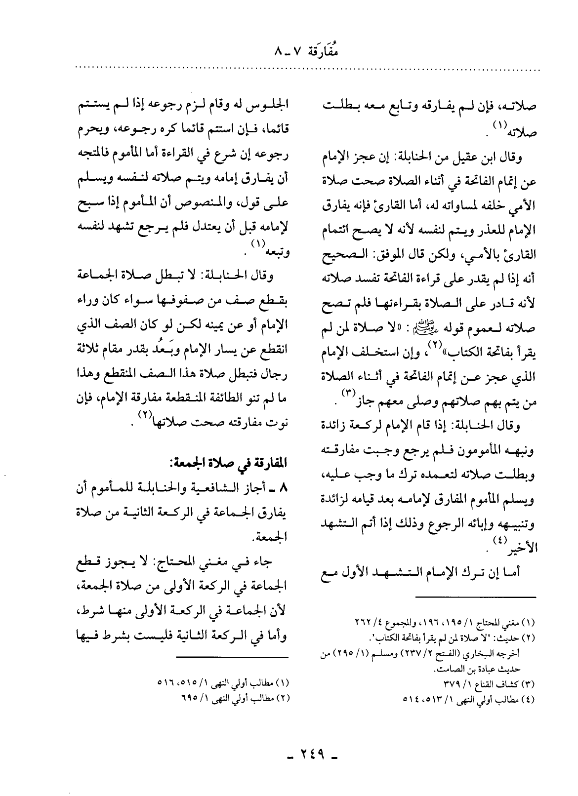 8 - أَجَازَ الشَّافِعِيَّةُ وَالْحَنَابِلَةُ لِلْمَأْمُومِ أَنْ يُفَارِقَ الْجَمَاعَةَ فِي الرَّكْعَةِ الثَّانِيَةِ مِنْ صَلاَةِ الْجُمُعَةِ.