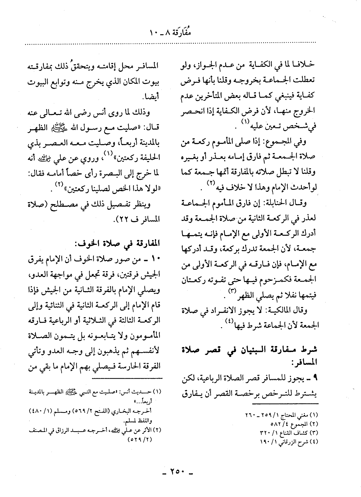 9 - يَجُوزُ لِلْمُسَافِرِ قَصْرُ الصَّلاَةِ الرُّبَاعِيَّةِ، لَكِنْ يُشْتَرَطُ لِلتَّرَخُّصِ بِرُخْصَةِ الْقَصْرِ أَنْ يُفَارِقَ
