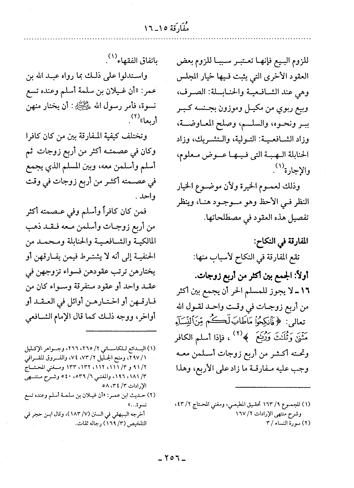 16 - لاَ يَجُوزُ لِلْمُسْلِمِ الْحُرِّ أَنْ يَجْمَعَ بَيْنَ أَكْثَرَ مِنْ أَرْبَعِ زَوْجَاتٍ فِي وَقْتٍ وَاحِدٍ؛ لِقَوْل اللَّهِ تَعَالَى: {فَانْكِحُوا مَا طَابَ لَكُمْ مِنَ النِّسَاءِ مَثْنَى وَثُلاَثَ وَرُبَاعَ} (2) ، فَإِذَا أَسْلَمَ الْكَافِرُ وَتَحْتَهُ أَكْثَرُ مِنْ أَرْبَعِ زَوْجَاتٍ أَسْلَمْنَ مَعَهُ وَجَبَ عَلَيْهِ مُفَارَقَةُ مَا زَادَ عَلَى الأَْرْبَعِ، وَهَذَا