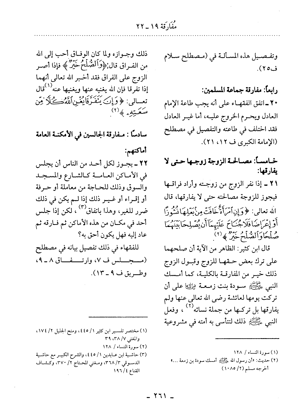 21 - إِذَا نَفَرَ الزَّوْجُ مِنْ زَوْجَتِهِ وَأَرَادَ فِرَاقَهَا فَيَجُوزُ لِلزَّوْجَةِ مُصَالَحَتُهُ حَتَّى لاَ يُفَارِقَهَا، قَال اللَّهُ تَعَالَى: {وَإِنِ امْرَأَةٌ خَافَتْ مِنْ بَعْلِهَا نُشُوزًا أَوْ إِعْرَاضًا فَلاَ جُنَاحَ عَلَيْهِمَا أَنْ يُصْلِحَا بَيْنَهُمَا صُلْحًا وَالصُّلْحُ خَيْرٌ} (1)