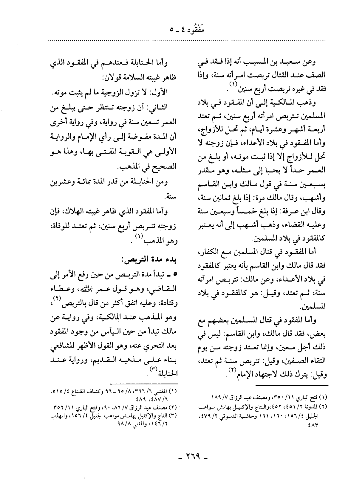 وَعَنْ سَعِيدِ بْنِ الْمُسَيَّبِ أَنَّهُ إِذَا فُقِدَ فِي الصَّفِّ عِنْدَ الْقِتَال تَرَبَّصَتِ امْرَأَتُهُ سَنَةً، وَإِذَا فُقِدَ فِي غَيْرِهِ تَرَبَّصَتْ أَرْبَعَ سِنِينَ (1) .