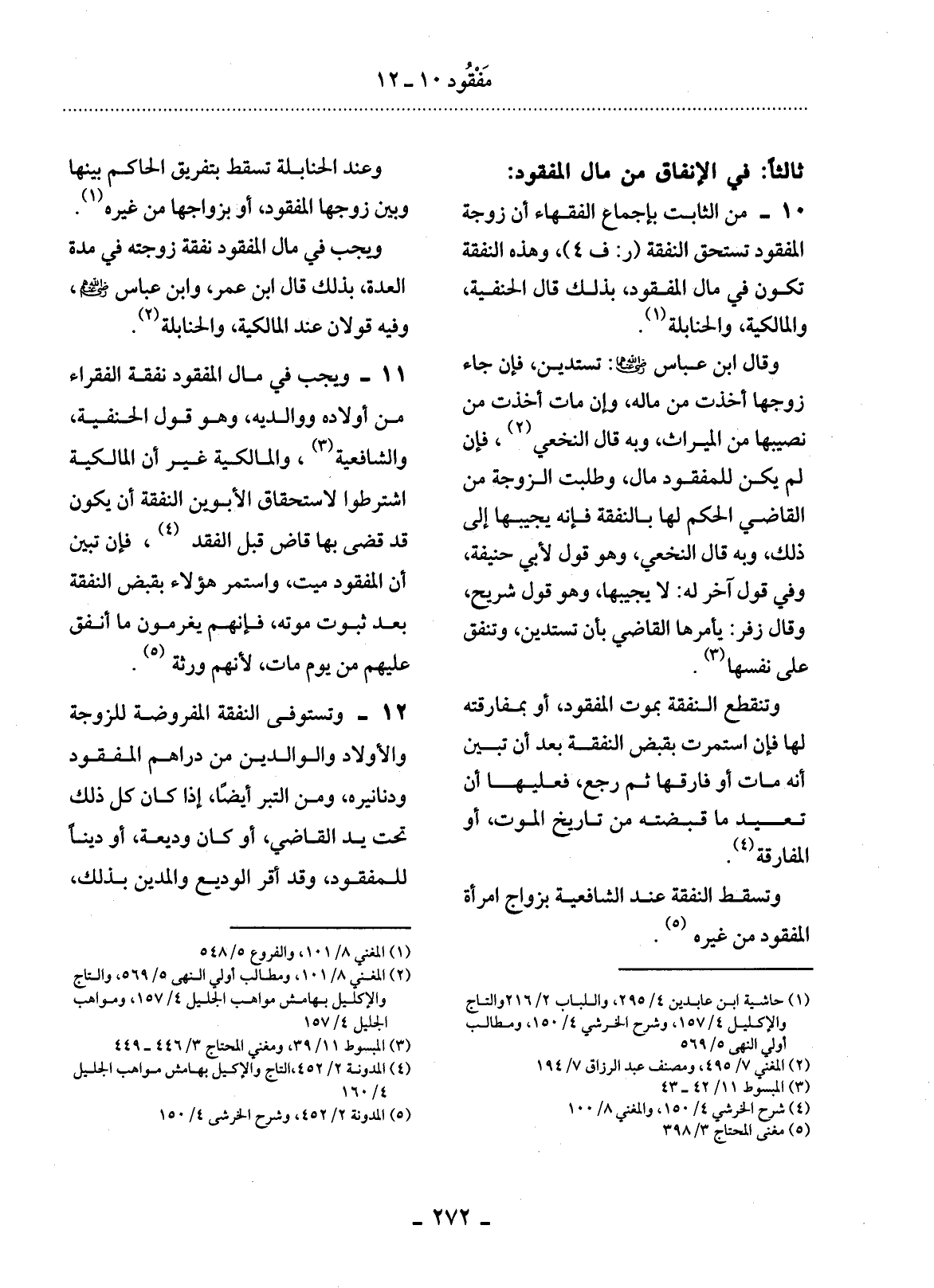 10 - مِنَ الثَّابِتِ بِإِجْمَاعِ الْفُقَهَاءِ أَنَّ زَوْجَةَ الْمَفْقُودِ تَسْتَحِقُّ النَّفَقَةَ (ر: ف 4) ، وَهَذِهِ النَّفَقَةُ تَكُونُ فِي مَال الْمَفْقُودِ، بِذَلِكَ قَال الْحَنَفِيَّةُ، وَالْمَالِكِيَّةُ وَالْحَنَابِلَةُ (1) .