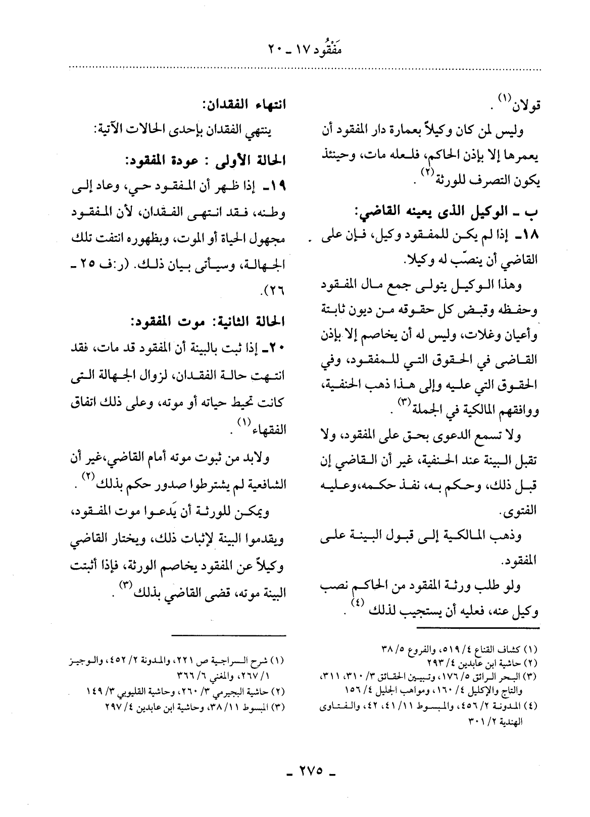 18 - إِذَا لَمْ يَكُنْ لِلْمَفْقُودِ وَكِيلٌ فَإِنَّ عَلَى الْقَاضِي أَنْ يُنَصِّبَ لَهُ وَكِيلاً.