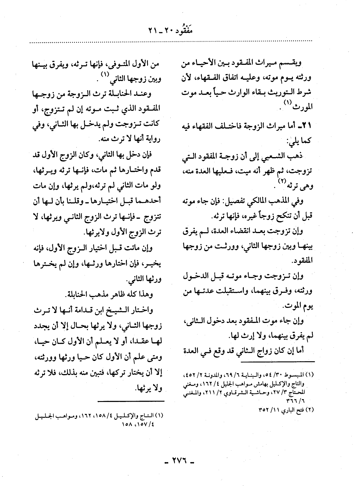 21 - أَمَّا مِيرَاثُ الزَّوْجَةِ فَاخْتَلَفَ الْفُقَهَاءُ فِيهِ كَمَا يَلِي: ذَهَبَ الشَّعْبِيُّ إِلَى أَنَّ زَوْجَةَ الْمَفْقُودِ الَّتِي تَزَوَّجَتْ، ثُمَّ ظَهَرَ أَنَّهُ مَيِّتٌ فَعَلَيْهَا الْعِدَّةُ مِنْهُ، وَهِيَ تَرِثُهُ. (2)