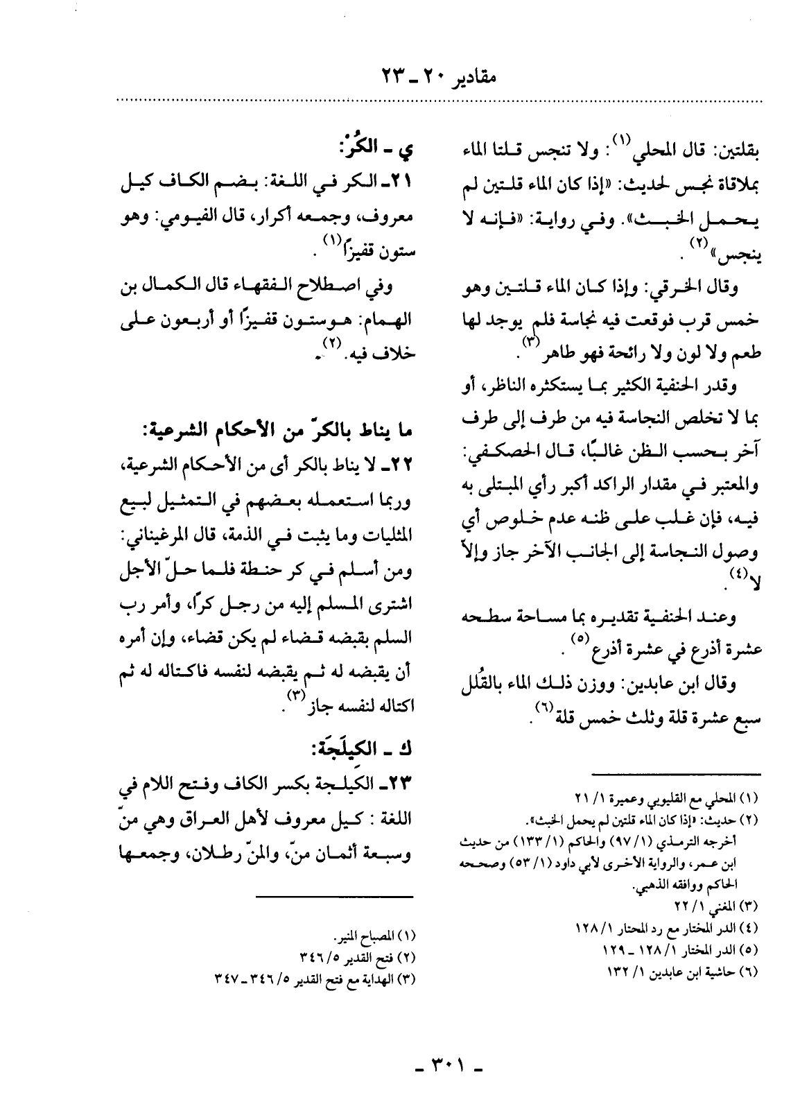 21 - الْكُرُّ فِي اللُّغَةِ: بِضَمِّ الْكَافِ كَيْلٌ مَعْرُوفٌ، وَجَمْعُهُ أَكْرَارٌ، قَال الْفَيُّومِيُّ: وَهُوَ سِتُّونَ قَفِيزًا. (1)