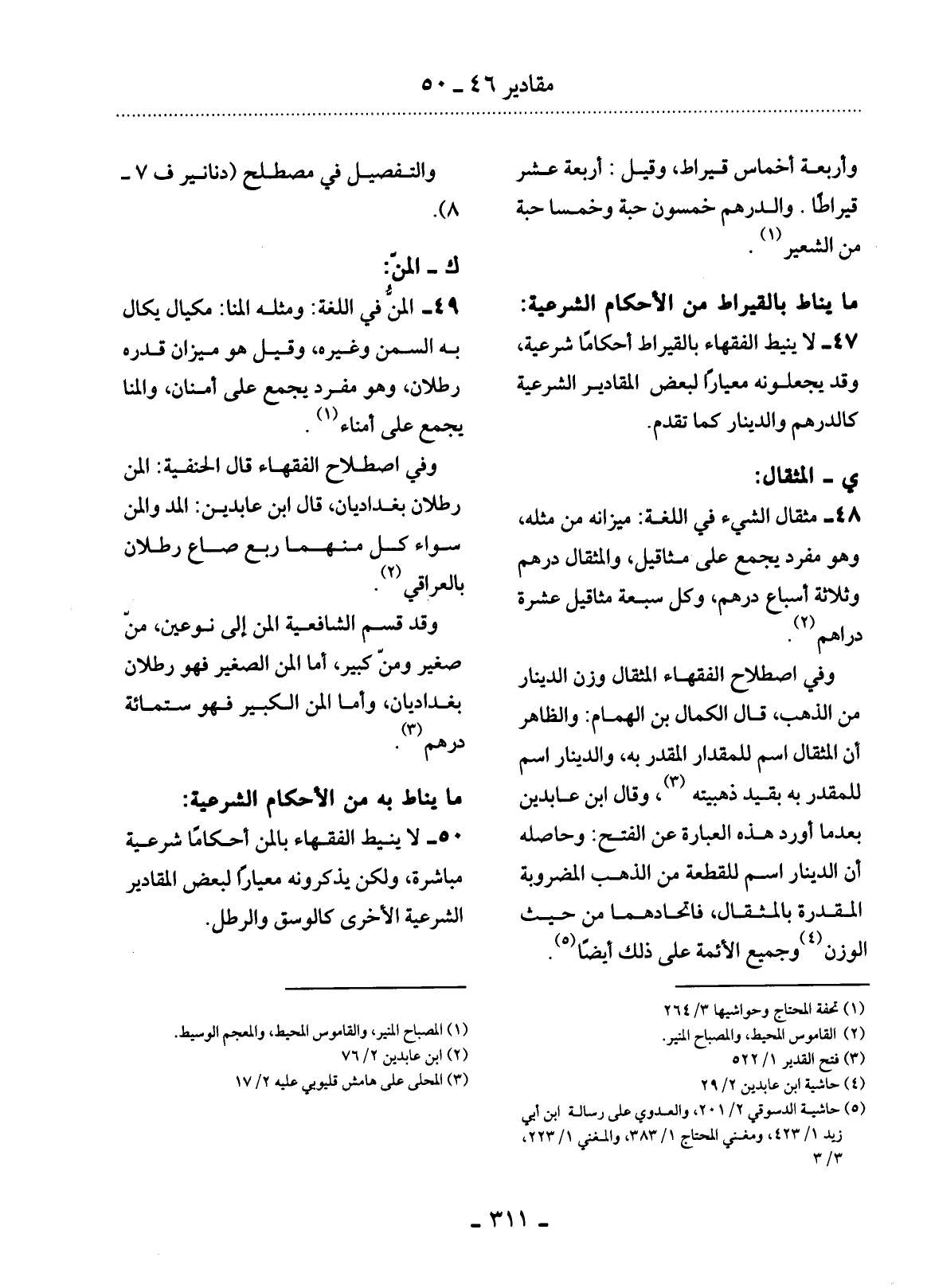 50 - لاَ يُنِيطُ الْفُقَهَاءُ بِالْمَنِّ أَحْكَامًا شَرْعِيَّةً مُبَاشِرَةً، وَلَكِنْ يَذْكُرُونَهُ مِعْيَارًا لِبَعْضِ الْمَقَادِيرِ الشَّرْعِيَّةِ الأُْخْرَى كَالْوَسْقِ وَالرِّطْل.