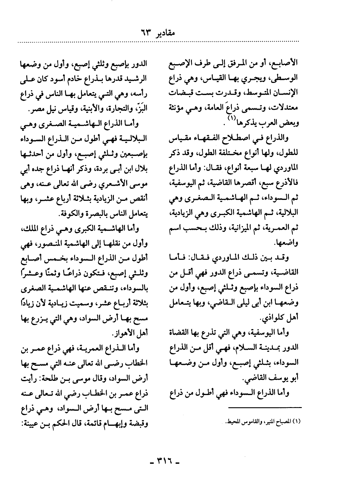 وَأَمَّا الْهَاشِمِيَّةُ الْكُبْرَى وَهِيَ ذِرَاعُ الْمَلِكِ، وَأَوَّل مَنْ نَقَلَهَا إِلَى الْهَاشِمِيَّةِ الْمَنْصُورُ، فَهِيَ أَطْوَل مِنَ الذِّرَاعِ السَّوْدَاءِ بِخَمْسِ أَصَابِعَ وَثُلُثَيْ إِصْبَعٍ، فَتَكُونُ ذِرَاعًا وَثُمُنًا وَعُشْرًا بِالسَّوْدَاءِ، وَتَنْقُصُ عَنْهَا الْهَاشِمِيَّةُ الصُّغْرَى بِثَلاَثَةِ أَرْبَاعِ عُشْرٍ، وَسُمِّيَتْ زِيَادِيَّةً لأَِنَّ زِيَادًا مَسَحَ بِهَا أَرْضَ السَّوَادِ، وَهِيَ الَّتِي يَزْرَعُ بِهَا أَهْل الأَْهْوَازِ.