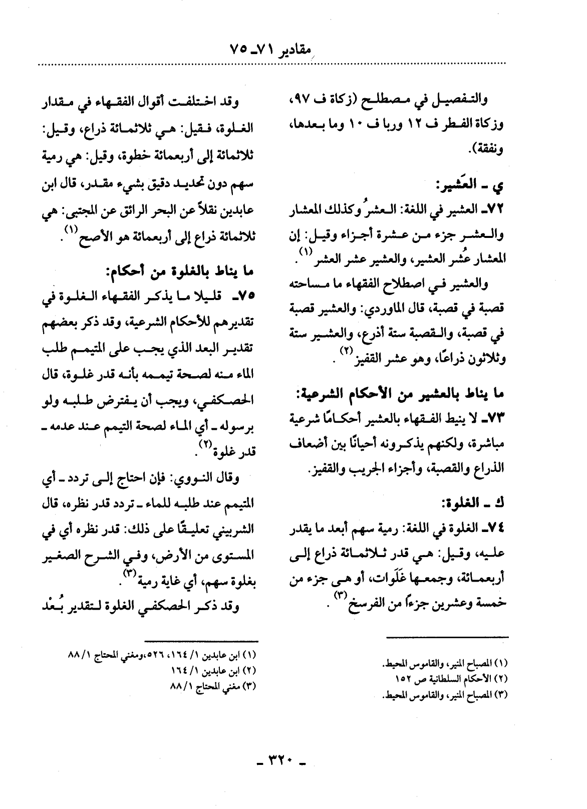 73 - لاَ يُنِيطُ الْفُقَهَاءُ بِالْعَشِيرِ أَحْكَامًا شَرْعِيَّةً مُبَاشِرَةً، وَلَكِنَّهُمْ يَذْكُرُونَهُ أَحْيَانًا بَيْنَ أَضْعَافِ الذِّرَاعِ وَالْقَصَبَةِ، وَأَجْزَاءِ الْجَرِيبِ وَالْقَفِيزِ.