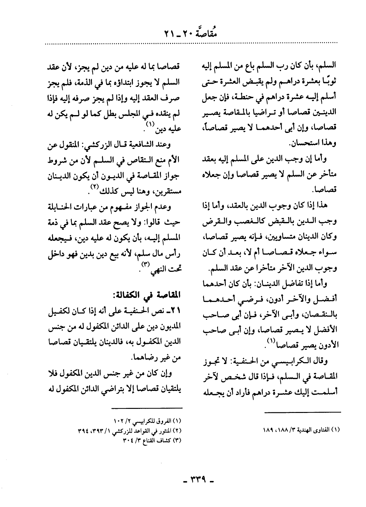 السَّلَمِ، بِأَنْ كَانَ رَبُّ السَّلَمِ بَاعَ مِنَ الْمُسْلَمِ إِلَيْهِ ثَوْبًا بِعَشَرَةِ دَرَاهِمَ وَلَمْ يَقْبِضِ الْعَشَرَةَ حَتَّى أَسْلَمَ إِلَيْهِ عَشَرَةَ دَرَاهِمَ فِي حِنْطَةٍ، فَإِنْ جَعَل الدَّيْنَيْنِ قِصَاصًا أَوْ تَرَاضَيَا بِالْمُقَاصَّةِ يَصِيرُ قِصَاصًا، وَإِنْ أَبَى أَحَدُهُمَا لاَ يَصِيرُ قِصَاصًا، وَهَذَا اسْتِحْسَانٌ.