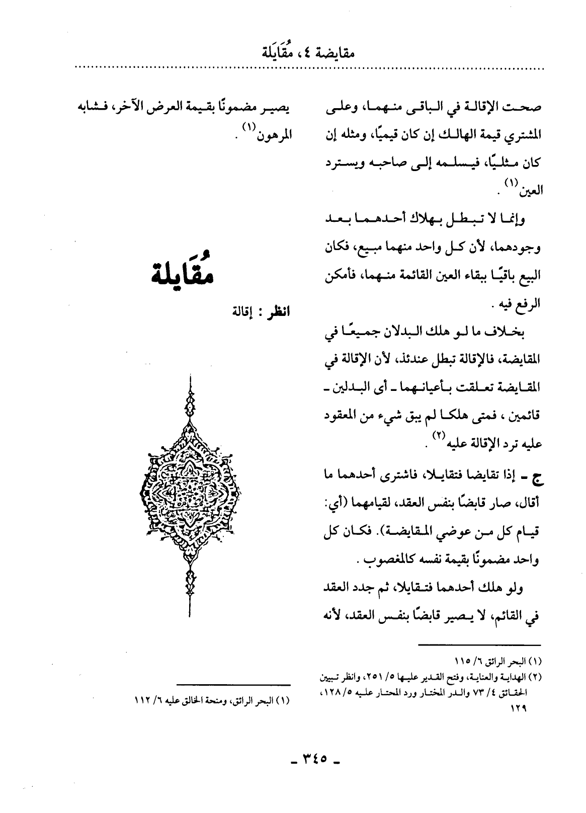 بِخِلاَفِ مَا لَوْ هَلَكَ الْبَدَلاَنِ جَمِيعًا فِي الْمُقَايَضَةِ، فَالإِْقَالَةُ تَبْطُل عِنْدَئِذٍ، لأَِنَّ الإِْقَالَةَ فِي الْمُقَايَضَةِ تَعَلَّقَتْ بِأَعْيَانِهِمَا - أَيِ الْبَدَلَيْنِ - قَائِمَيْنِ، فَمَتَى هَلَكَا لَمْ يَبْقَ شَيْءٌ مِنَ الْمَعْقُودِ عَلَيْهِ تُرَدُّ الإِْقَالَةُ عَلَيْهِ (2) .