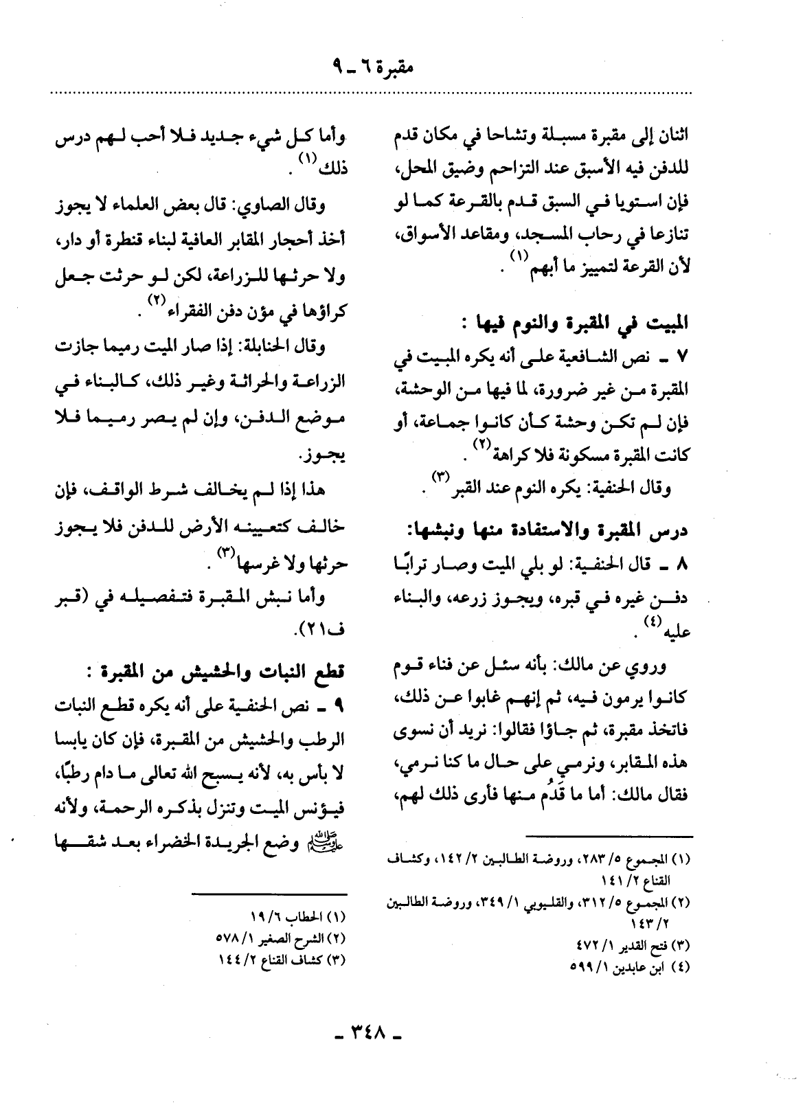9 - نَصَّ الْحَنَفِيَّةُ عَلَى أَنَّهُ يُكْرَهُ قَطْعُ النَّبَاتِ الرَّطْبِ وَالْحَشِيشِ مِنَ الْمَقْبَرَةِ، فَإِنْ كَانَ يَابِسًا لاَ بَأْسَ بِهِ، لأَِنَّهُ يُسَبِّحُ اللَّهَ تَعَالَى مَا دَامَ رَطْبًا، فَيُؤْنِسُ الْمَيِّتَ وَتَنْزِل بِذِكْرِهِ الرَّحْمَةُ، وَلأَِنَّهُ صَلَّى اللَّهُ عَلَيْهِ وَسَلَّمَ وَضَعَ الْجَرِيدَةَ الْخَضْرَاءَ بَعْدَ شَقِّهَا