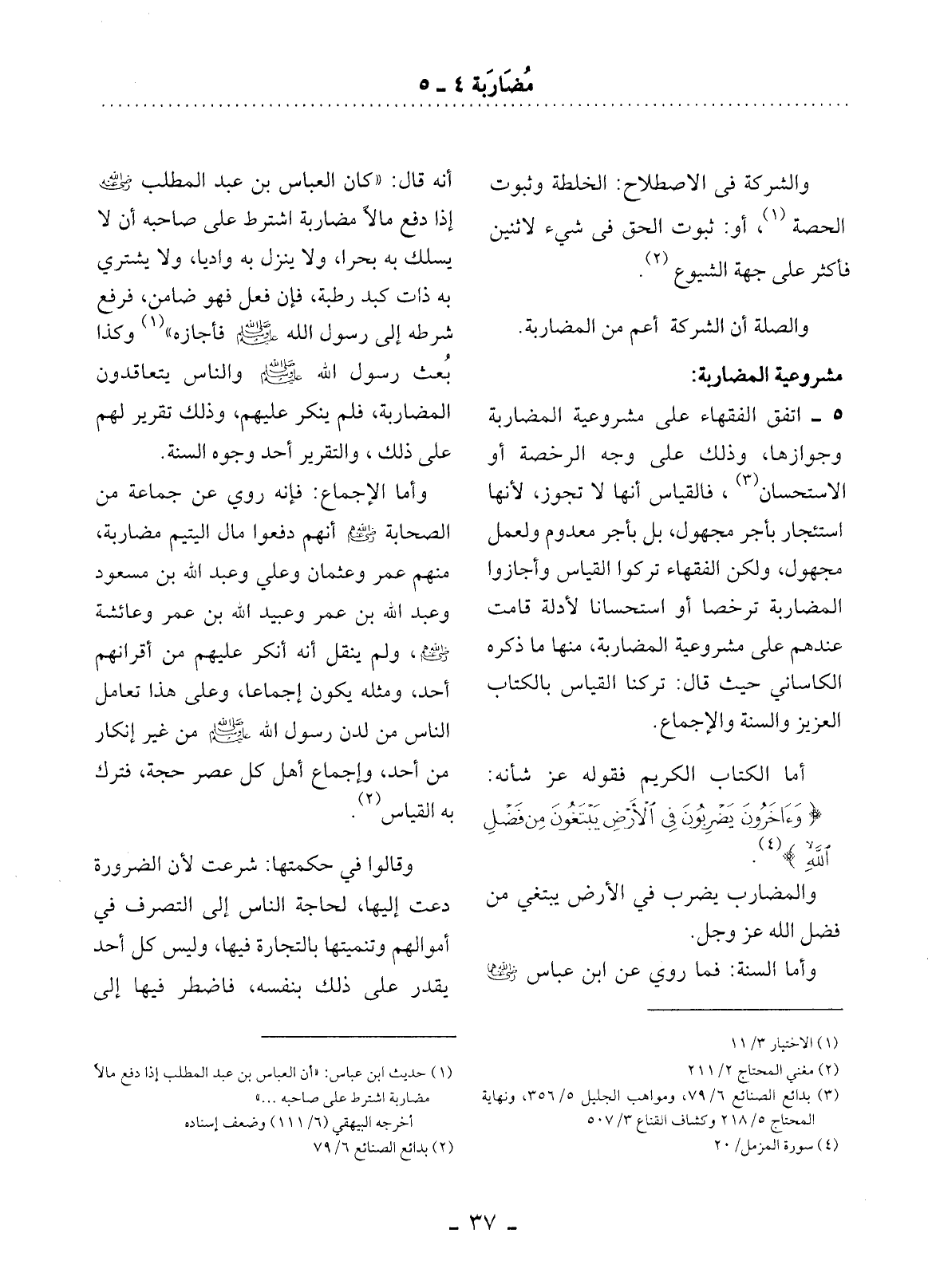 (1) حديث ابن عباس: " أن العباس بن عبد المطلب إذا دفع مالاً مضاربة اشترط على صاحبه. . . ". أخرجه البيهقي (6 / 111) وضعف إسناده.