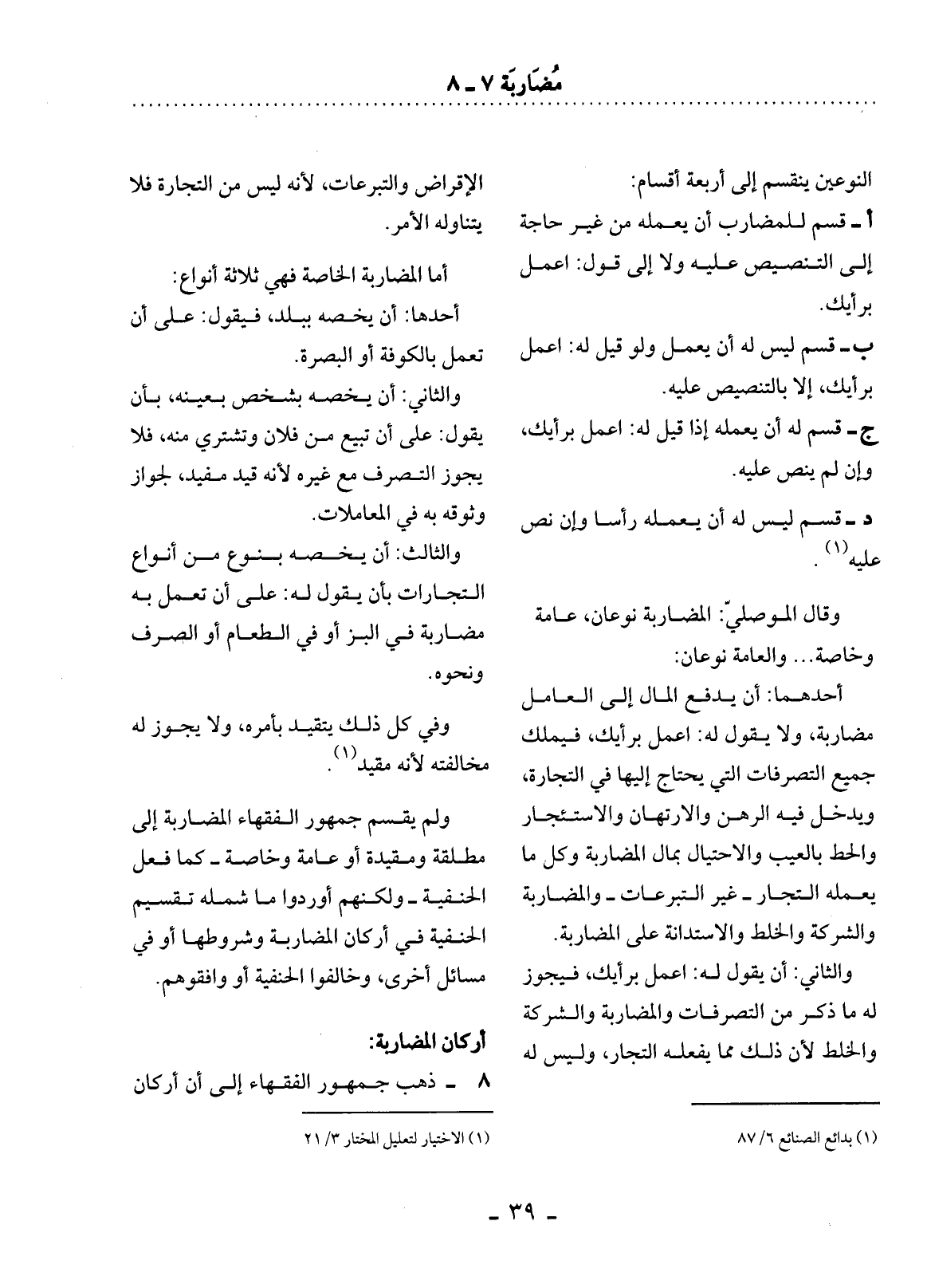 وَقَال الْمُوصِلِيُّ: الْمُضَارَبَةُ نَوْعَانِ، عَامَّةٌ وَخَاصَّةٌ. وَالْعَامَّةُ نَوْعَانِ: