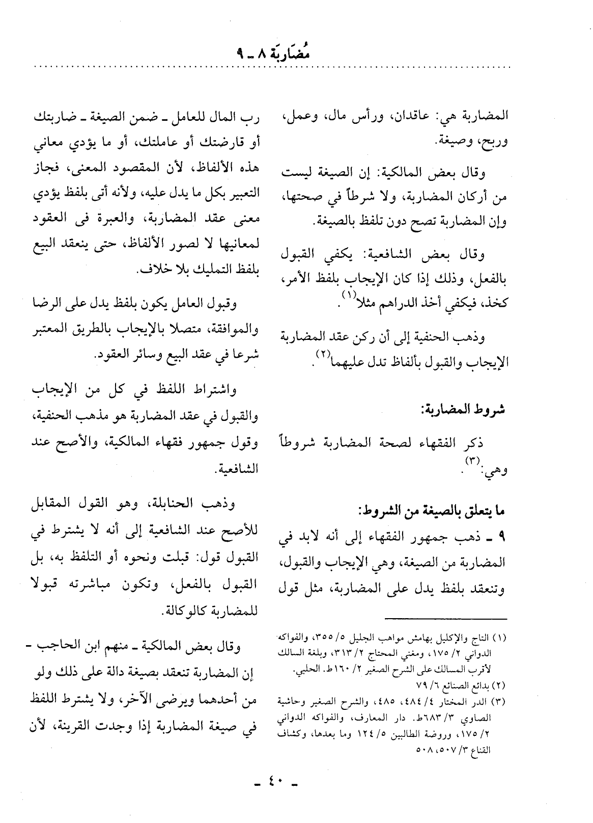 9 - ذَهَبَ جُمْهُورُ الْفُقَهَاءِ إِِلَى أَنَّهُ لاَ بُدَّ فِي الْمُضَارَبَةِ مِنَ الصِّيغَةِ، وَهِيَ الإِِِْيجَابُ وَالْقَبُول، وَتَنْعَقِدُ بِلَفْظٍ يَدُل عَلَى الْمُضَارَبَةِ، مِثْل قَوْل