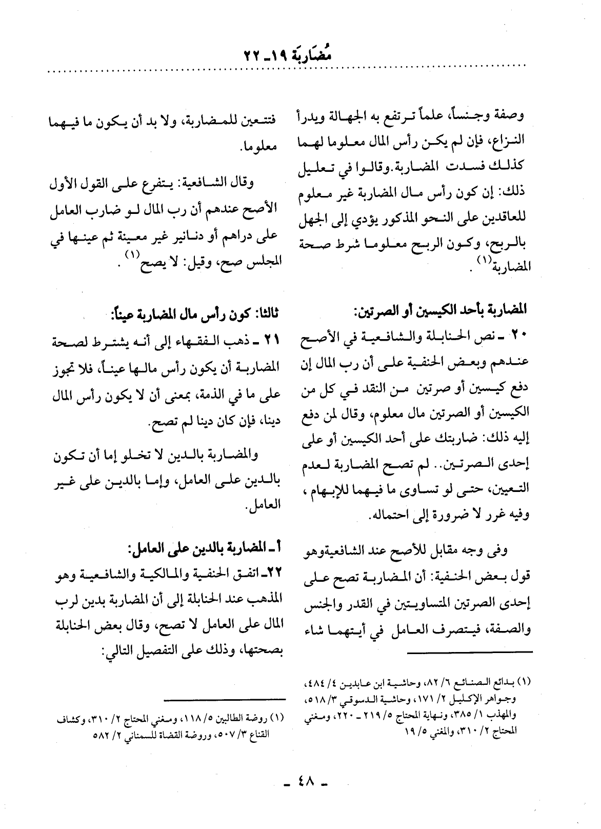 20 - نَصَّ الْحَنَابِلَةُ وَالشَّافِعِيَّةُ فِي الأَْصَحِّ عِنْدَهُمْ وَبَعْضُ الْحَنَفِيَّةِ عَلَى أَنَّ رَبَّ الْمَال إِِنْ دَفَعَ كِيسَيْنِ أَوْ صُرَّتَيْنِ مِنَ النَّقْدِ فِي كُلٍّ مِنَ الْكِيسَيْنِ أَوِ الصُّرَّتَيْنِ مَالٌ مَعْلُومٌ، وَقَال لِمَنْ دَفَعَ إِِلَيْهِ ذَلِكَ: ضَارَبْتُكَ عَلَى أَحَدِ الْكِيسَيْنِ أَوْ عَلَى إِِحْدَى الصُّرَّتَيْنِ. لَمْ تَصِحَّ الْمُضَارَبَةُ لِعَدَمِ التَّعْيِينِ، حَتَّى لَوْ تَسَاوَى مَا فِيهِمَا لِلإِِِْبْهَامِ، وَفِيهِ غَرَرٌ لاَ ضَرُورَةَ إِِلَى احْتِمَالِهِ.