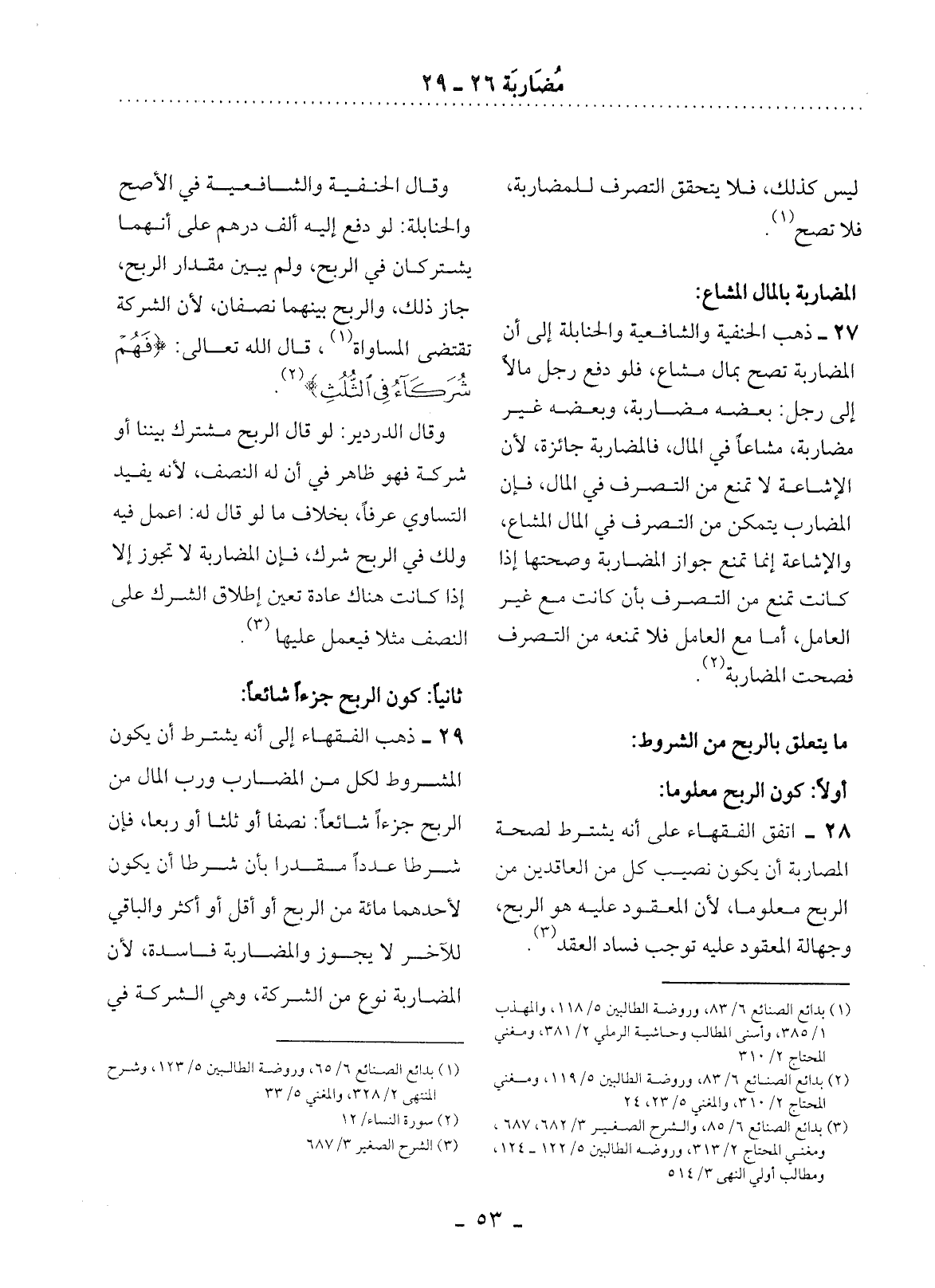 29 - ذَهَبَ الْفُقَهَاءُ إِِلَى أَنَّهُ يُشْتَرَطُ أَنْ يَكُونَ الْمَشْرُوطُ لِكُلٍّ مِنَ الْمُضَارِبِ وَرَبِّ الْمَال مِنَ الرِّبْحِ جُزْءًا شَائِعًا نِصْفًا أَوْ ثُلُثًا أَوْ رُبُعًا، فَإِِِنْ شَرَطَا عَدَدًا مُقَدَّرًا بِأَنْ شَرَطَا أَنْ يَكُونَ لأَِحَدِهِمَا مِائَةٌ مِنَ الرِّبْحِ أَوْ أَقَل أَوْ أَكْثَرُ وَالْبَاقِي لِلآْخَرِ لاَ يَجُوزُ وَالْمُضَارَبَةُ فَاسِدَةٌ، لأَِنَّ الْمُضَارَبَةَ نَوْعٌ مِنَ الشَّرِكَةِ، وَهِيَ الشَّرِكَةُ فِي