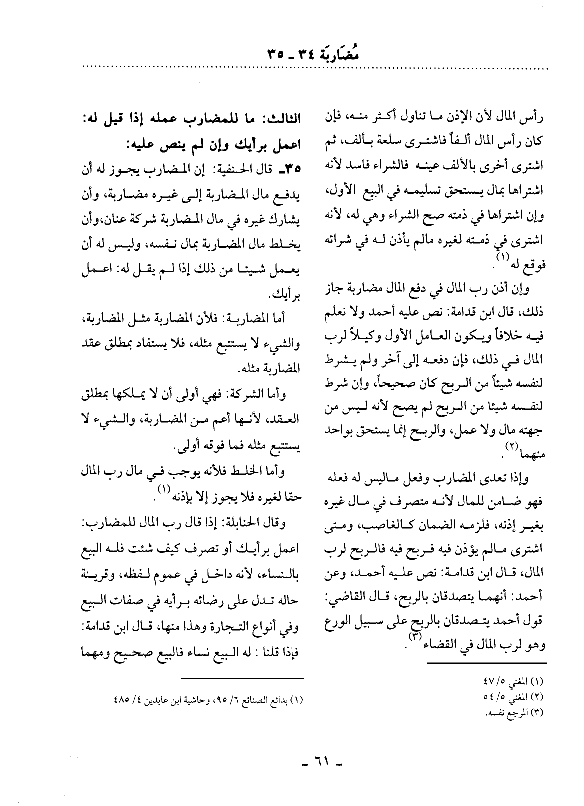 35 - قَال الْحَنَفِيَّةُ: إِِنَّ الْمُضَارِبَ يَجُوزُ لَهُ أَنْ يَدْفَعَ مَال الْمُضَارَبَةِ إِِلَى غَيْرِهِ مُضَارَبَةً، وَأَنْ يُشَارِكَ غَيْرَهُ فِي مَال الْمُضَارَبَةِ شَرِكَةَ عَنَانٍ، وَأَنْ يَخْلِطَ مَال الْمُضَارَبَةِ بِمَال نَفْسِهِ، وَلَيْسَ لَهُ أَنْ يَعْمَل شَيْئًا مِنْ ذَلِكَ إِِذَا لَمْ يَقُل لَهُ: اعْمَل بِرَأْيِكَ.