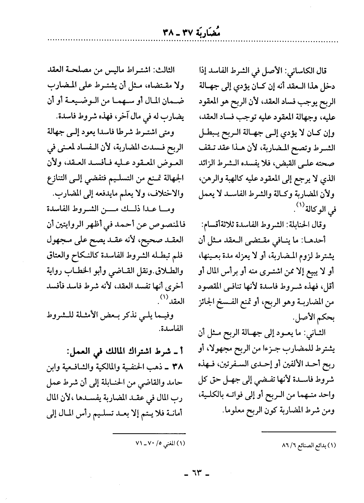 38 - ذَهَبَ الْحَنَفِيَّةُ وَالْمَالِكِيَّةُ وَالشَّافِعِيَّةُ وَابْنُ حَامِدٍ وَالْقَاضِي مِنَ الْحَنَابِلَةِ إِِلَى أَنَّ شَرْطَ عَمَل رَبِّ الْمَال فِي عَقْدِ الْمُضَارَبَةِ يُفْسِدُهَا، لأَِنَّ الْمَال أَمَانَةٌ فَلاَ يَتِمُّ إِِلاَّ بَعْدَ تَسْلِيمِ رَأْسِ الْمَال إِِلَى