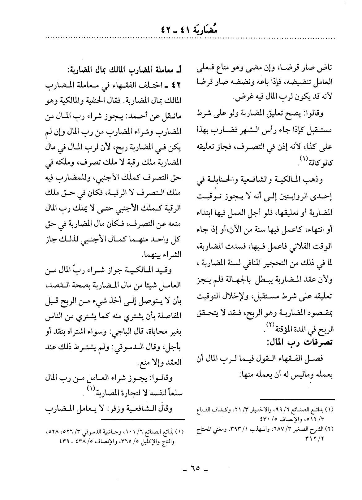 42 - اخْتَلَفَ الْفُقَهَاءُ فِي مُعَامَلَةِ الْمُضَارِبِ الْمَالِكَ بِمَال الْمُضَارَبَةِ. فَقَال الْحَنَفِيَّةُ وَالْمَالِكِيَّةُ وَهُوَ مَا نُقِل عَنْ أَحْمَدَ: يَجُوزُ شِرَاءُ رَبِّ الْمَال مِنَ الْمُضَارِبِ وَشِرَاءُ الْمُضَارِبِ مِنْ رَبِّ الْمَال وَإِِِنْ لَمْ يَكُنْ فِي الْمُضَارَبَةِ رِبْحٌ، لأَِنَّ لِرَبِّ الْمَال فِي مَال الْمُضَارَبَةِ مِلْكَ رَقَبَةٍ لاَ مِلْكَ تَصَرُّفٍ، وَمِلْكُهُ فِي حَقِّ التَّصَرُّفِ كَمِلْكِ الأَْجْنَبِيِّ، وَلِلْمُضَارِبِ فِيهِ مِلْكُ التَّصَرُّفِ لاَ الرِّقْبَةِ، فَكَانَ فِي حَقِّ مِلْكِ الرِّقْبَةِ كَمِلْكِ الأَْجْنَبِيِّ حَتَّى لاَ يَمْلِكَ رَبُّ الْمَال مَنْعَهُ عَنِ التَّصَرُّفِ، فَكَانَ مَال الْمُضَارَبَةِ فِي حَقِّ كُل وَاحِدٍ مِنْهُمَا كَمَال الأَْجْنَبِيِّ لِذَلِكَ جَازَ الشِّرَاءُ بَيْنَهُمَا.