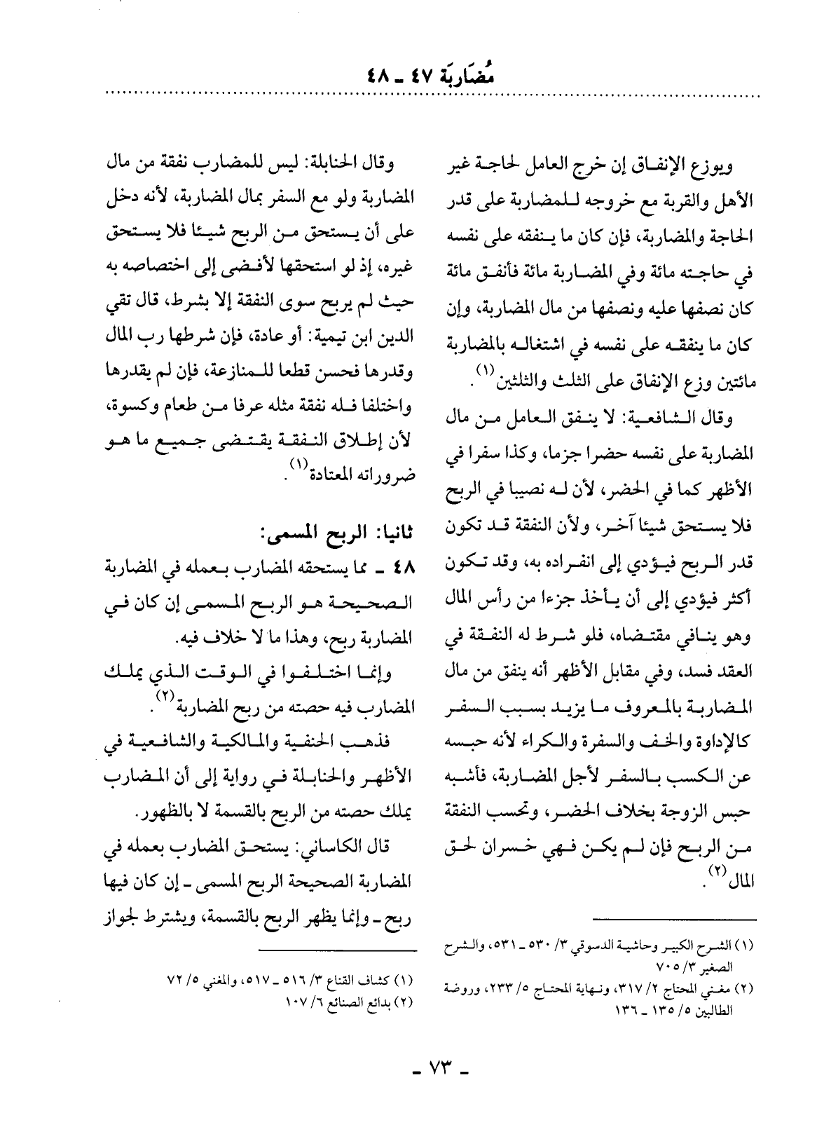 48 - مِمَّا يَسْتَحِقُّهُ الْمُضَارِبُ بِعَمَلِهِ فِي الْمُضَارَبَةِ الصَّحِيحَةِ هُوَ الرِّبْحُ الْمُسَمَّى إِِنْ كَانَ فِي الْمُضَارَبَةِ رِبْحٌ، وَهَذَا مَا لاَ خِلاَفَ فِيهِ.