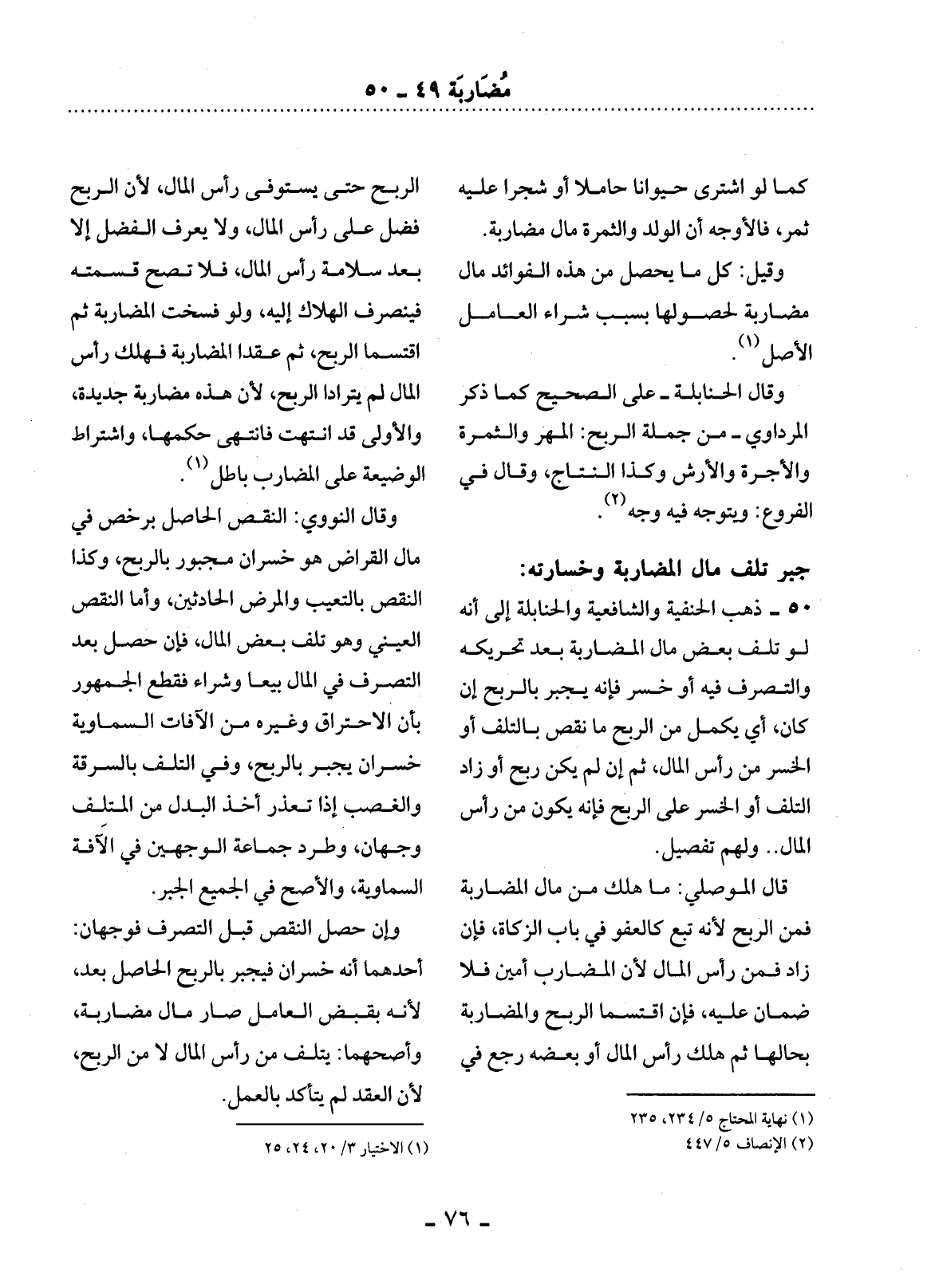 جَبْرُ تَلَفِ مَال الْمُضَارَبَةِ وَخَسَارَتُهُ 50 - ذَهَبَ الْحَنَفِيَّةُ وَالشَّافِعِيَّةُ وَالْحَنَابِلَةُ إِِلَى أَنَّهُ لَوْ تَلِفَ بَعْضُ مَال الْمُضَارَبَةِ بَعْدَ تَحْرِيكِهِ وَالتَّصَرُّفِ فِيهِ أَوْ خَسِرَ فَإِِِنَّهُ يُجْبَرُ بِالرِّبْحِ إِِنْ كَانَ، أَيْ يُكْمِل مِنَ الرِّبْحِ مَا نَقَصَ بِالتَّلَفِ أَوِ الْخُسْرِ مِنْ رَأْسِ الْمَال، ثُمَّ إِِنْ لَمْ يَكُنْ رَبِحَ أَوْ زَادَ التَّلَفُ أَوِ الْخُسْرُ عَلَى الرِّبْحِ فَإِِِنَّهُ يَكُونُ مِنْ رَأْسِ الْمَال. وَلَهُمْ تَفْصِيلٌ.